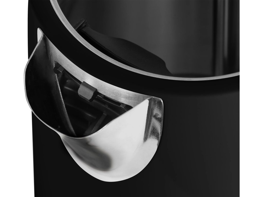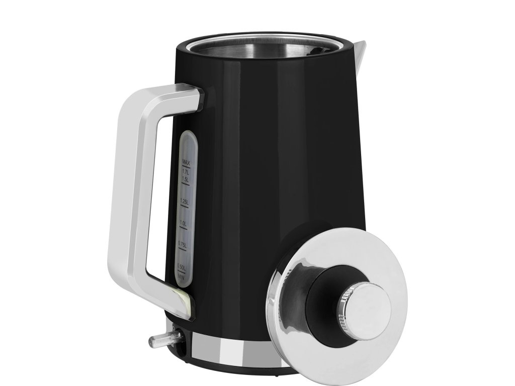 Rychlovarná konvice, příkon 1850-2200 W, objem 1,7 l, lakovaný kov v kombinaci s chromovými prvky, středový Strix konektor, 360° otočná základna s navíjením kabelu, vyjímatelný a omyvatelný filtr vodního kamene, automatické vypnutí, černá