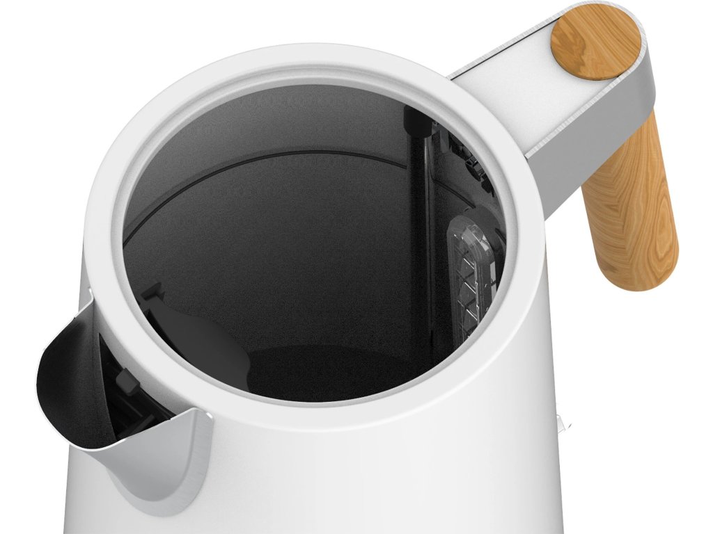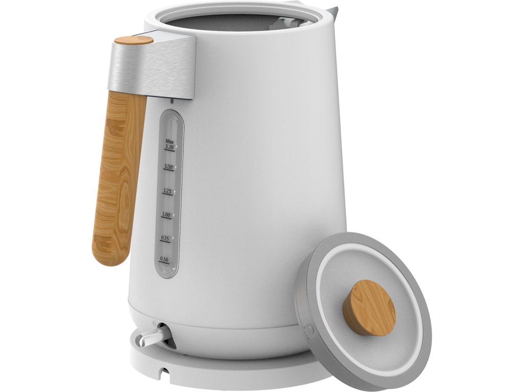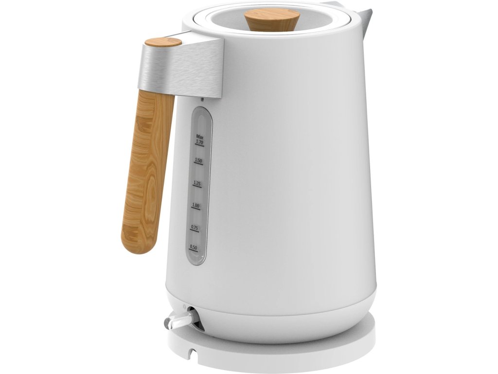 Rychlovarná konviuce, příkon 1850-2200 W, objem 1,7 l, nerezové provedení v kombinací s dřevem, středový Strix konektor, 360° otočná základna s navíjením kabelu, ochrana proti přehřátí při zapnutí bez vody, bílá