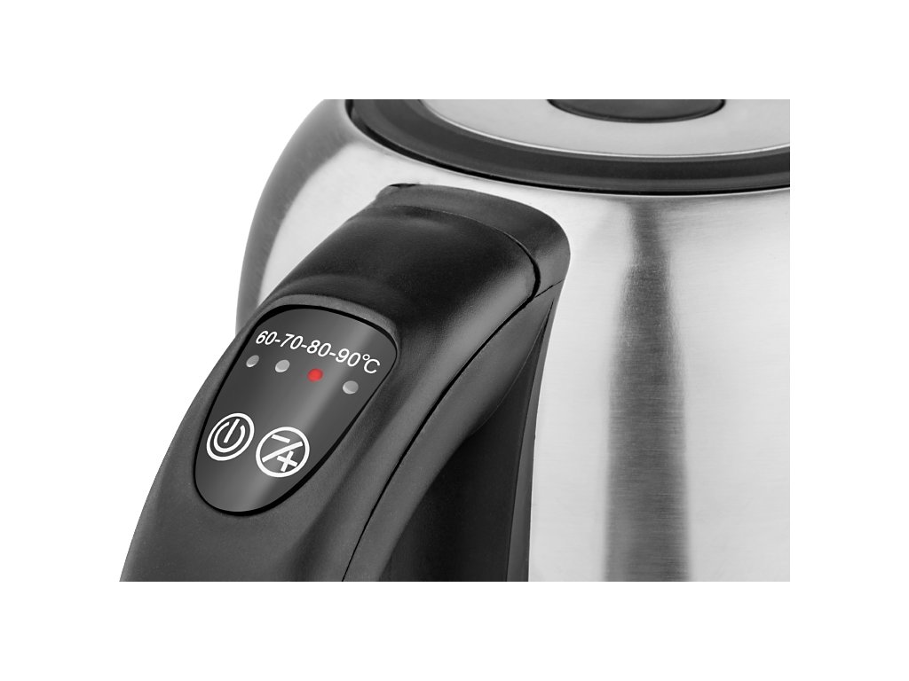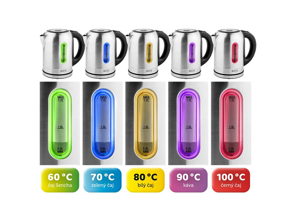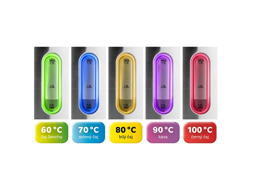 rychlovarná konvice • objem 1,7 l • 5barevná světelná signalizace provozu • nastavitelná teplota od 60 do 100 °C • ochrana proti přehřátí • délka kabelu 70 cm