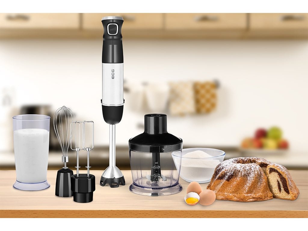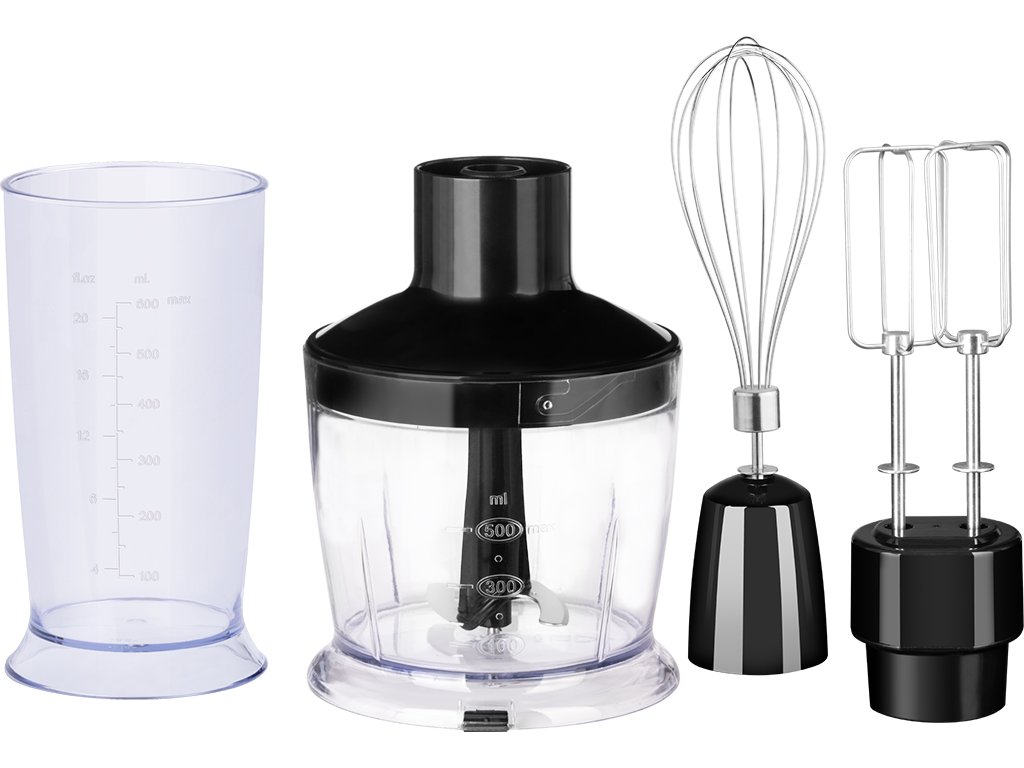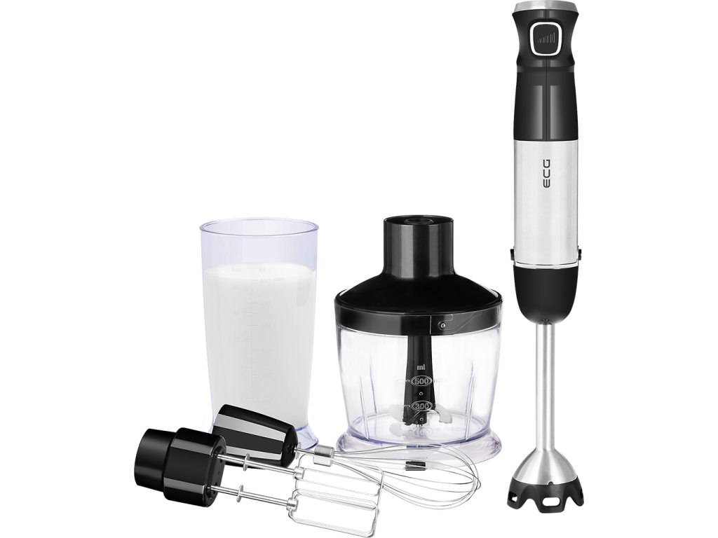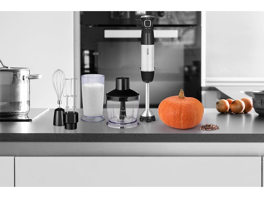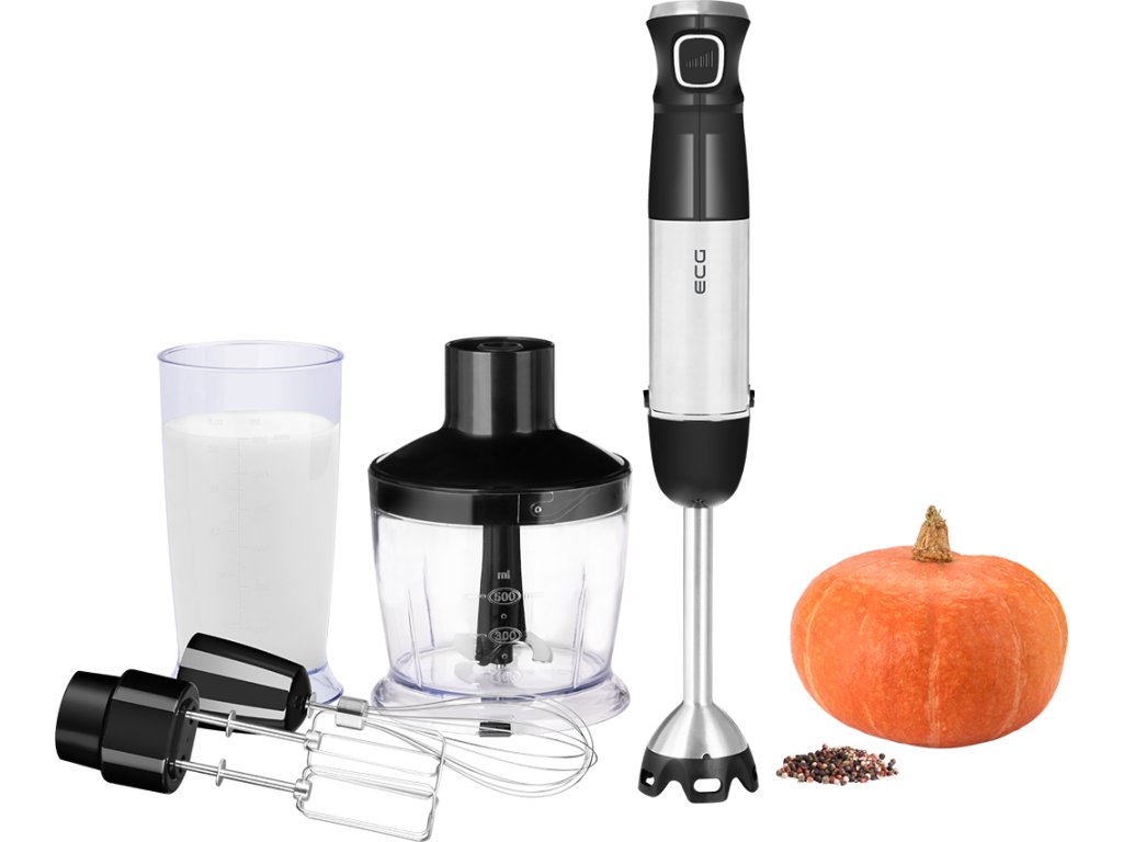 tyčový mixér, výkonný 800 W motor, kovová noha s 4 listovou čepelí z nerezové oceli , 500 ml nádoba na sekání se samostatnou čepelí, 600 ml odměrná nádoba, nástavec na šlehání sněhu, dvojitý nástavec na šlehání krémů, nerezový design s jednotlačítkovým ovládáním a praktickým 2 m krouceným kabelem, hlučnost 85 dB