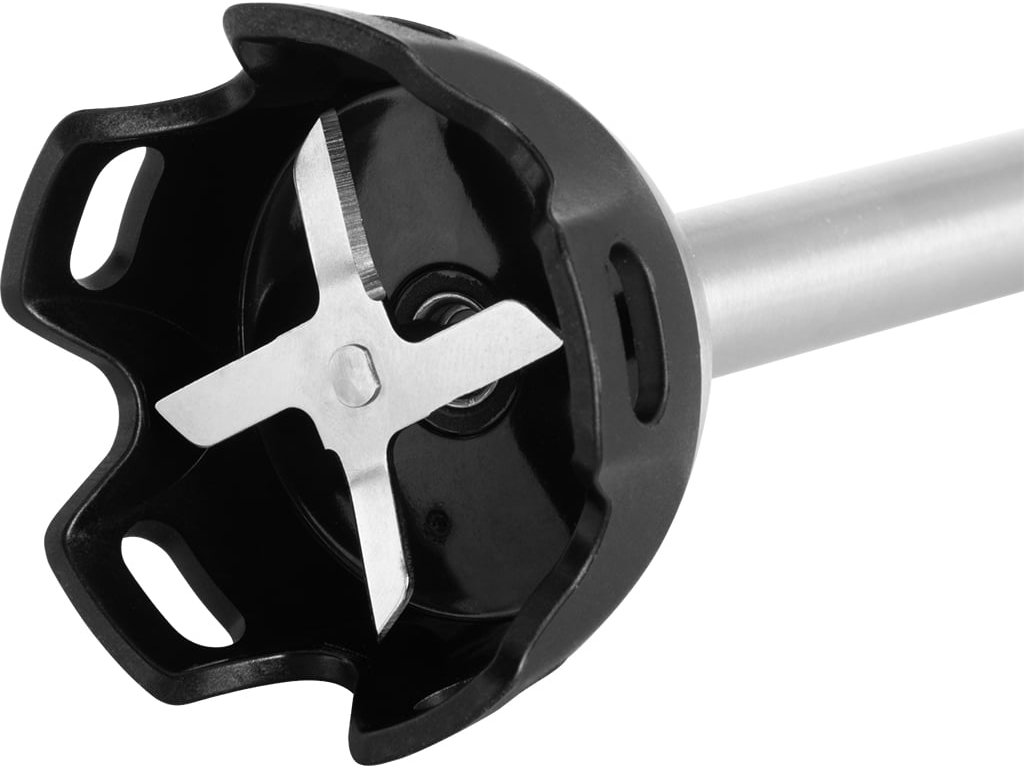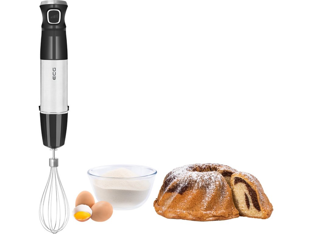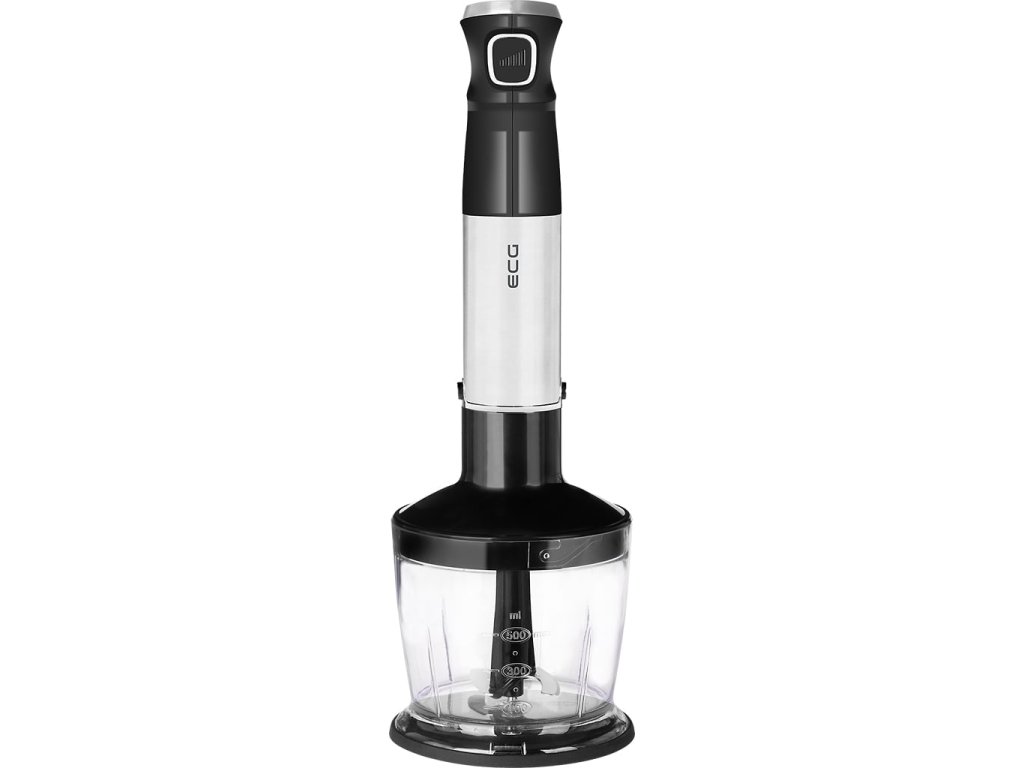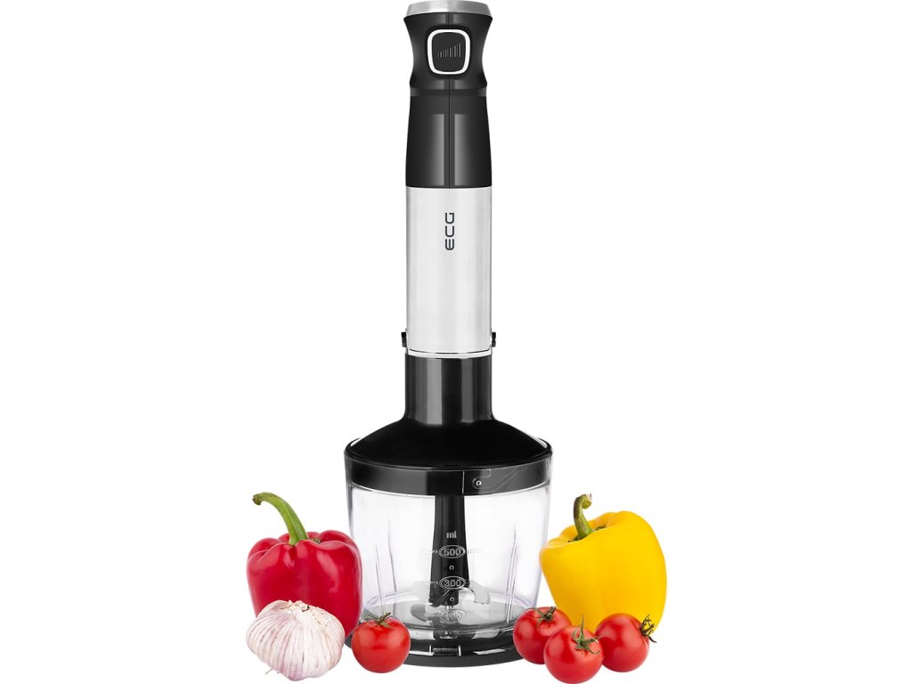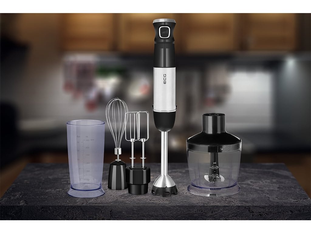 tyčový mixér, výkonný 800 W motor, kovová noha s 4 listovou čepelí z nerezové oceli , 500 ml nádoba na sekání se samostatnou čepelí, 600 ml odměrná nádoba, nástavec na šlehání sněhu, dvojitý nástavec na šlehání krémů, nerezový design s jednotlačítkovým ovládáním a praktickým 2 m krouceným kabelem, hlučnost 85 dB