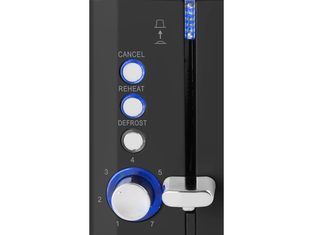 Topinkovač dvouštěrbinový, příkon 780-925 W, rozpékač pečiva, 7 stupňová regulace, podsvětlená tlačítka, automatické vypnutí, funkce přihřívání a rozmrazování, zásuvka na zbytky pečiva, světelná signalizace provozu, černý