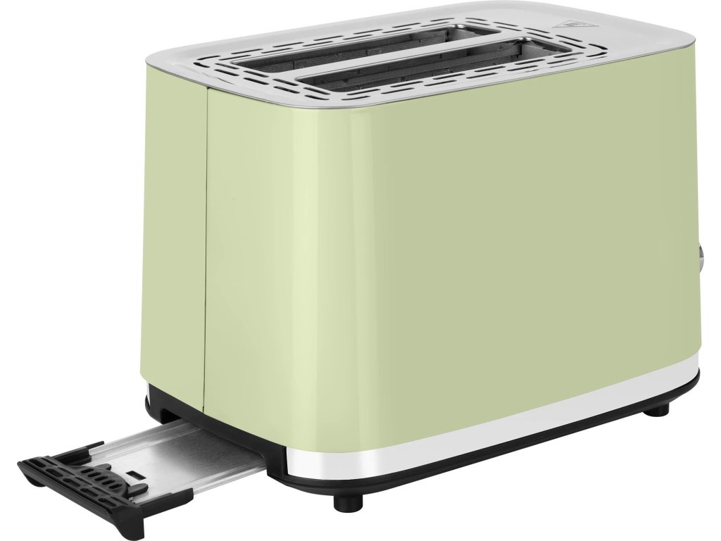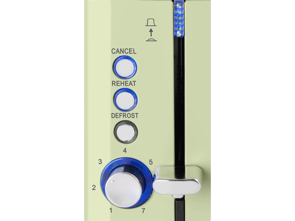 Topinkvač dvouštěrbinový, příkon 780-925 W, rozpékač pečiva, 7 stupňová regulace, podsvětlená tlačítka, automatické vypnutí, funkce přihřívání a rozmrazování, zásuvka na zbytky pečiva, světelná signalizace provozu, olivová barva
