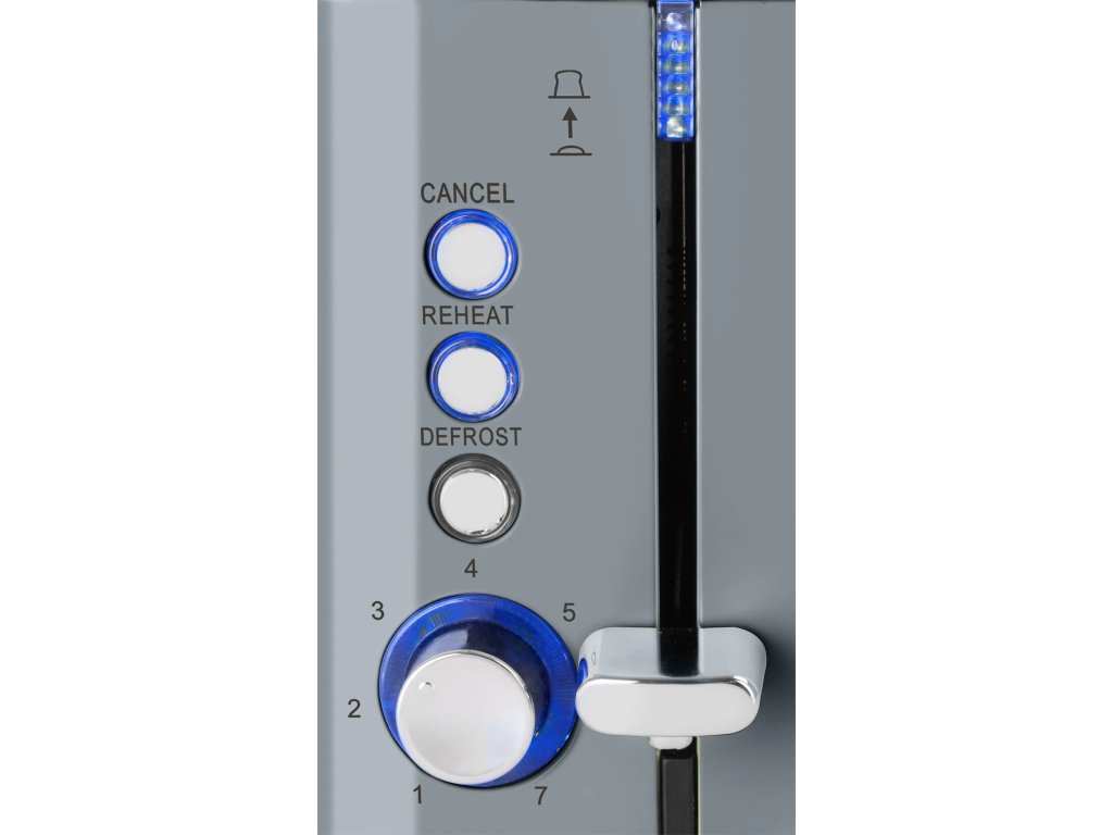 Topinkvač dvouštěrbinový, rozpékač pečiva, 7 stupňová regulace, podsvětlená tlačítka, automatické vypnutí, funkce přihřívání a rozmrazování, zásuvka na zbytky pečiva, světelná signalizace provozu, příkon 780-925 W, šedý