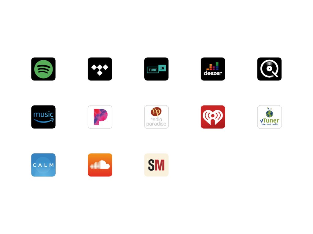 Podporované služby online streamování zvuku: Spotify, TIDAL, TuneIn, Deezer, Qobuz, Amazon Music, Pandora, Radio Paradise, iHeartRadio, vTuner, Calm Radio, SoundCloud, SoundMachine.