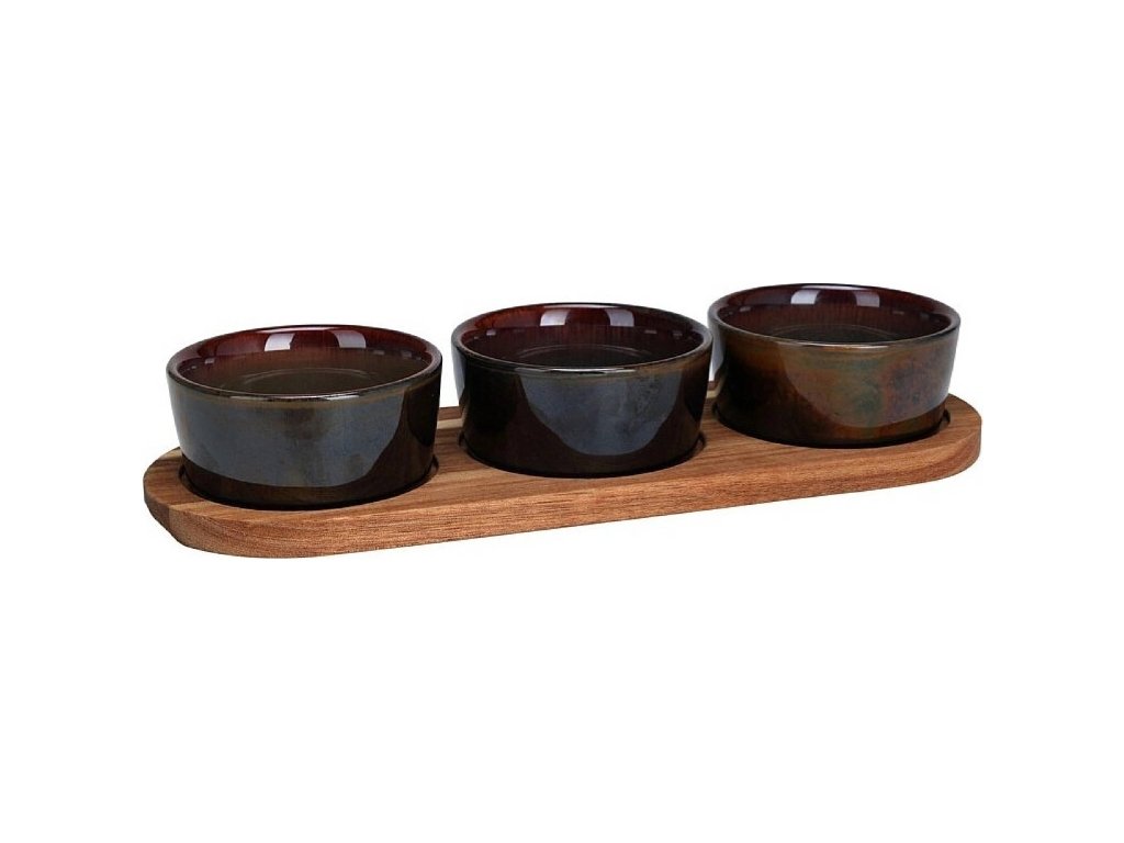 Očekáváte návštěvu a nevíte kam s občerstvením? V mističkách o rozměru 10 x 4 cm s oválným podnosem můžete servírovat různé dipy ke grilovanému masu nebo chuťovky k vínu a pivu.