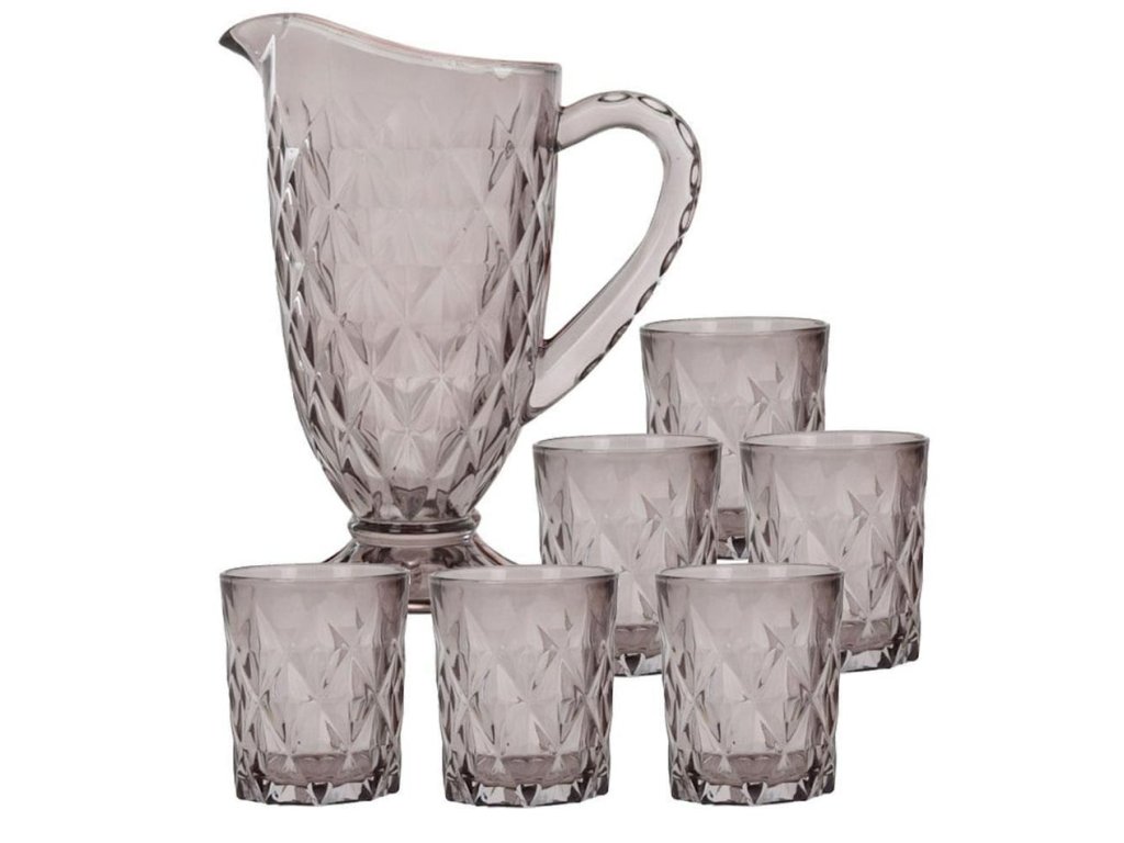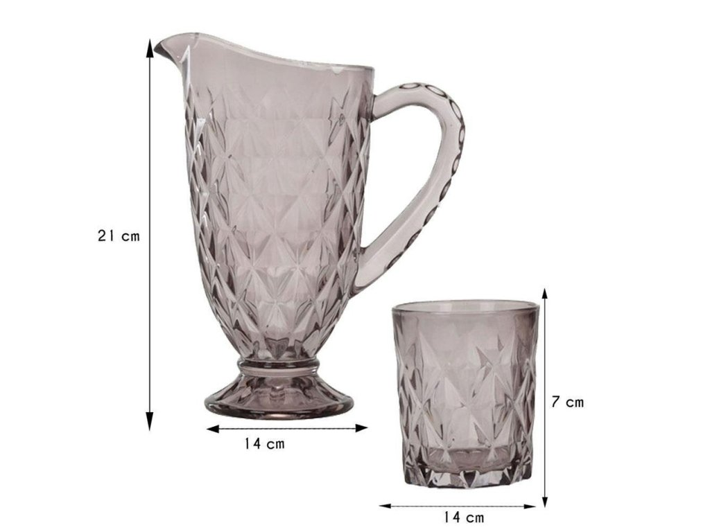 Elegantní sada 6 sklenic se džbánem, která vypadá krásně na jídelním stole i na terase. Skvěle se hodí k podávání džusů a všech druhů nápojů. Vyrobeno ze silného průhledného šedého skla. Vhodné pro servírování nealko i alko nápojů, limonád, ledových čajů, atd. Hezké balení ideální jako dárek