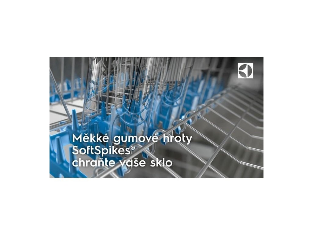 Horní košík má 6 měkkých špiček pro vinné sklenky, 2 skládací držáky, 2 skládací drátěné držáky pro skleničky, 2 měkké špičky, skládací poličky na šálky, Stainless steel handle Electrolux