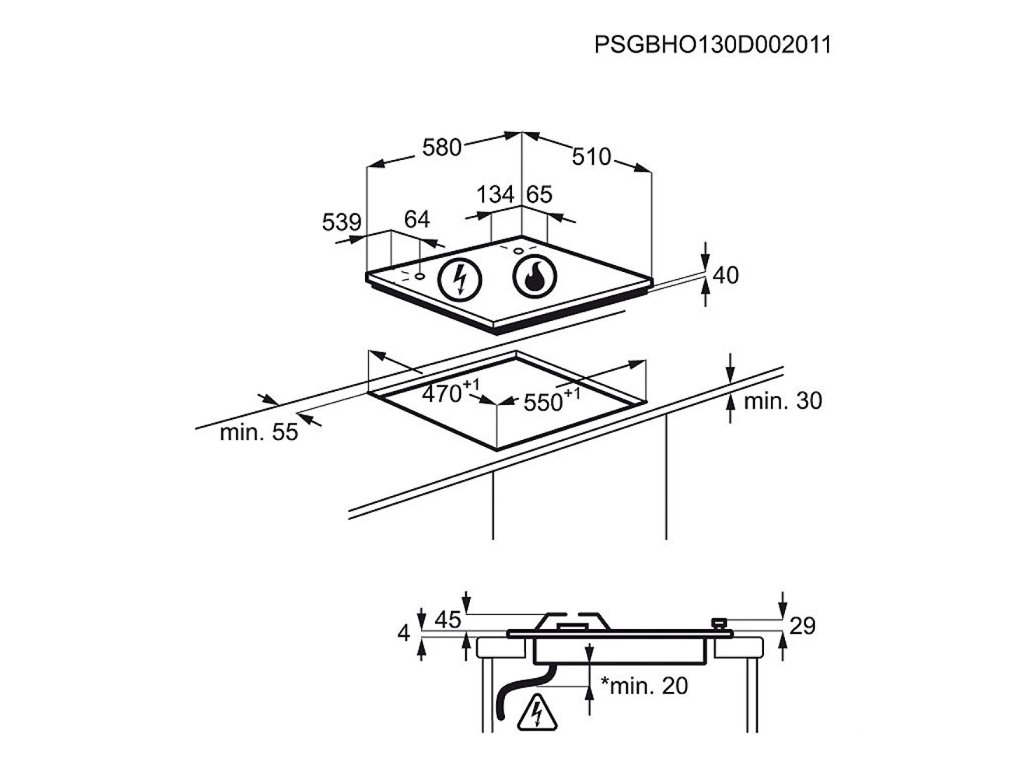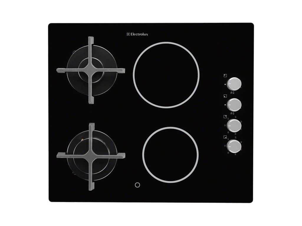 Vestavná kombinovaná plynová a sklokeramická varná deska, barva černé sklo, knoflíkové ovládání, 4 plotýnky, napájecí napětí 230V, šířka 58 cm.