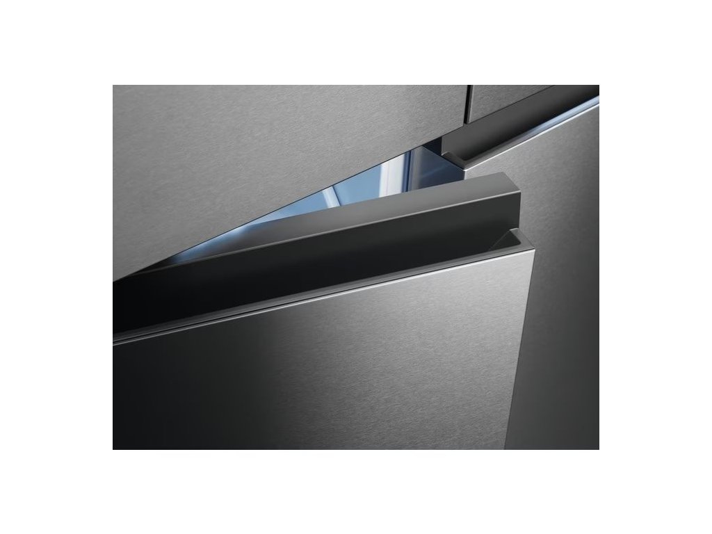 Volně stojící americká lednička s mrazákem dole, objem 343/179l, barva: šedá s nerezovým vzhledem, energetická třída E, technologie No Frost, elektronické a dotykové ovládání, šířka 91cm, výška 190 cm.