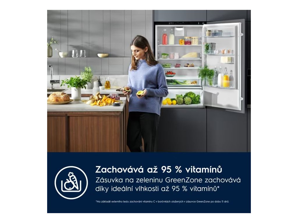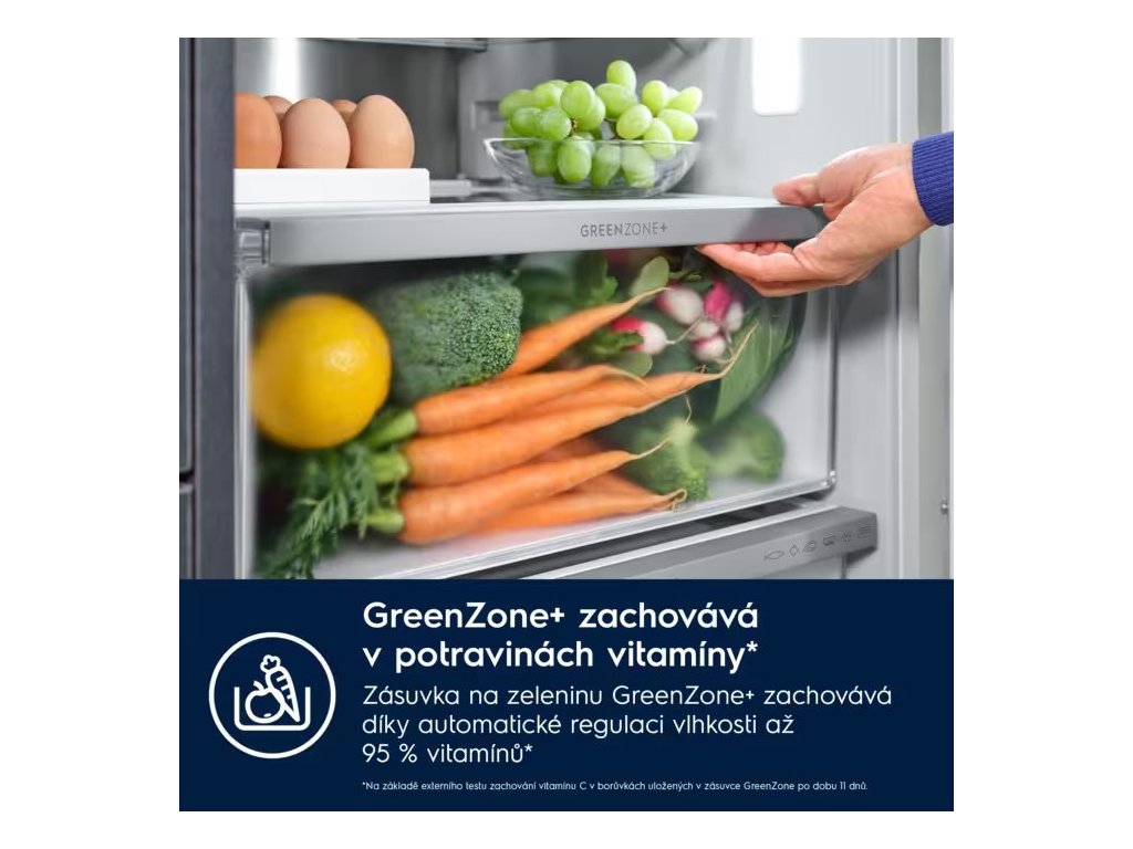 Chladnička s mrazničkou 700 GreenZone má utěsněnou zásuvku, kde je vlhkost udržována na vyvážené úrovni, řízením míry kondenzace, což pomáhá předcházet zkažení potravin. Správnou úrovní vlhkosti se tak zachovává až 95 % vitamínů.*
