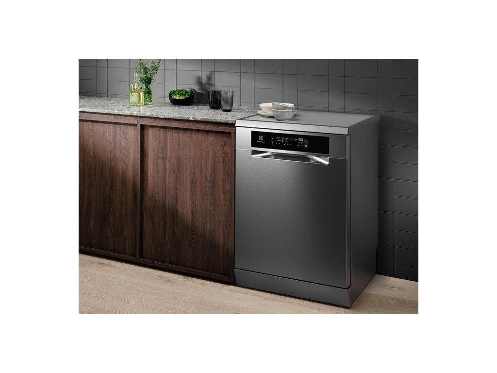 Horní košík má 6 měkkých špiček pro vinné sklenky, 2 skládací držáky, 2 skládací drátěné držáky pro skleničky, 2 měkké špičky, skládací poličky na šálky, Stainless steel handle Electrolux