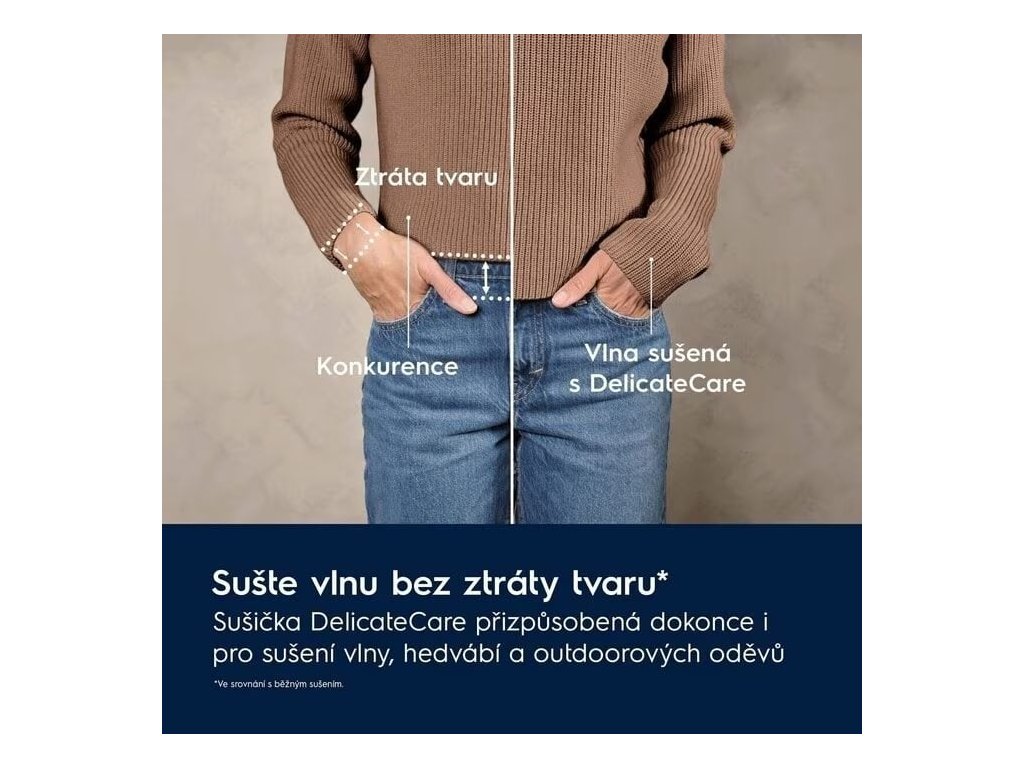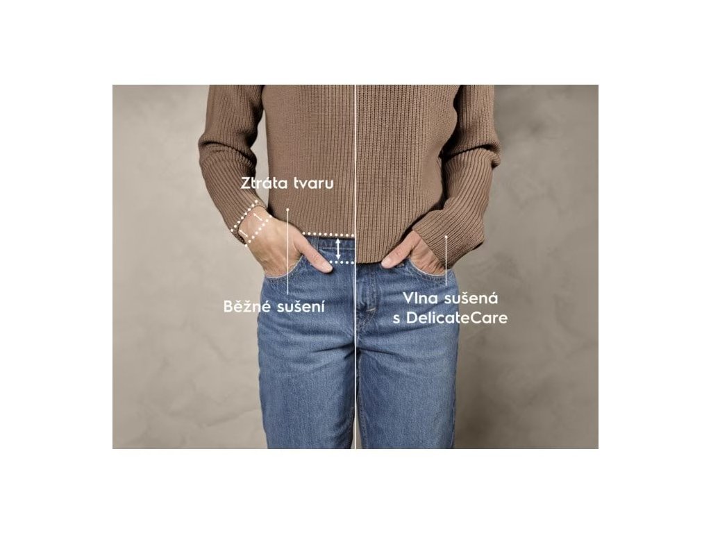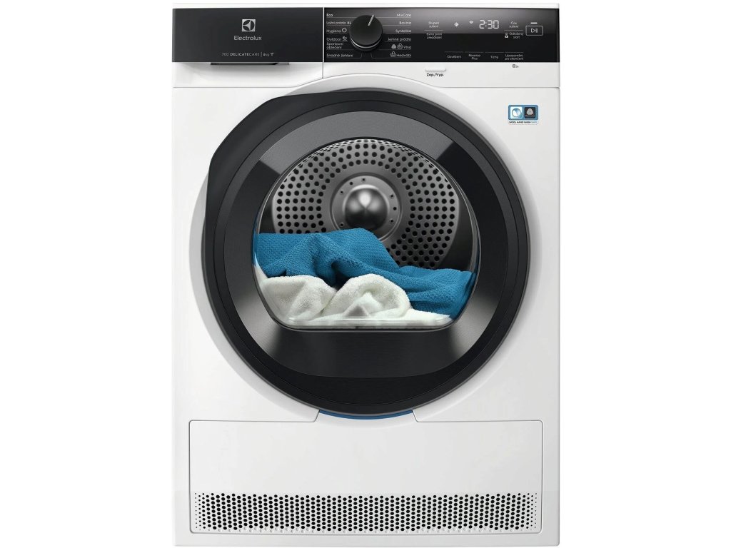 Volně stojící sušička prádla s tepelným čerpadlem, kapacita 8 kg, barva bílá, energetická třída B, technologie DelicateCare a SensiCare, šířka 60 cm, hloubka 66 cm, ovládání přes mobilní aplikaci.