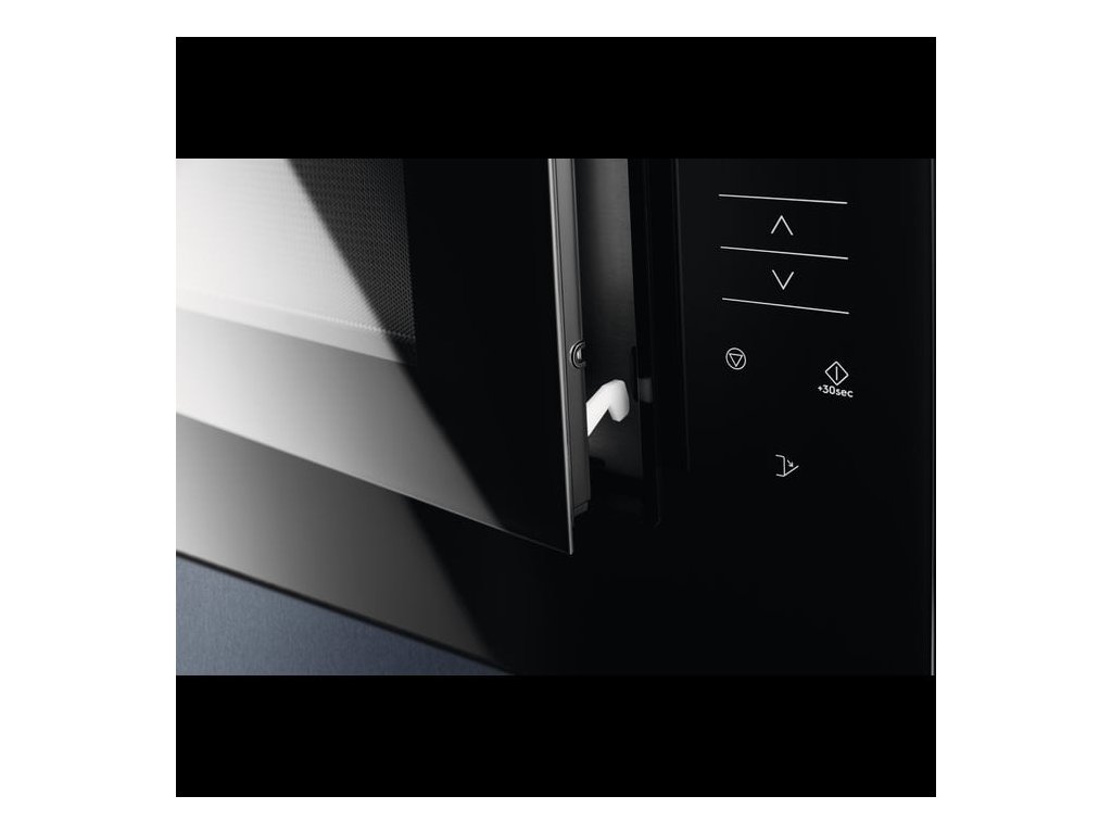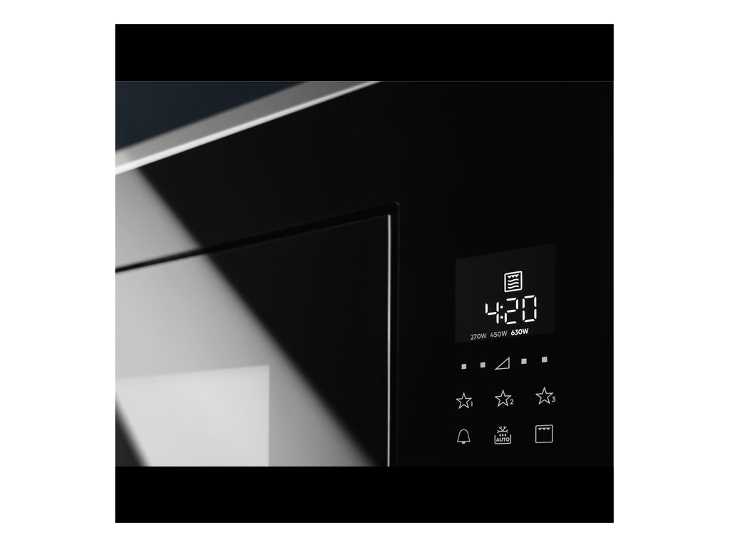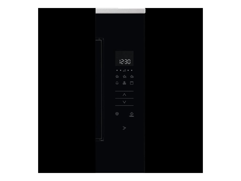 Vestavná mikrovlnná trouba, objem 20 l, barva černá, výkon mikrovlnného ohřevu: 900 W, výkon grilu 800 W, 5 stupňů výkonu, dotykové ovládání, výška 46 cm, šířka 59,5 cm, hloubka 40,4 cm.
