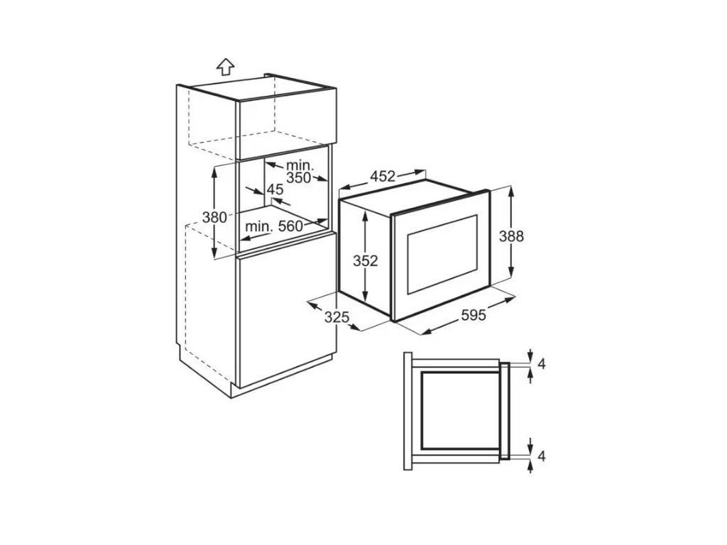 Vestavná mikrovlnná trouba, objem 20 l, barva černá, výkon mikrovlnného ohřevu: 700 W, 5 stupňů výkonu, mechanické ovládání, výška 38,8 cm, šířka 59,5 cm, hloubka 34,7 cm.