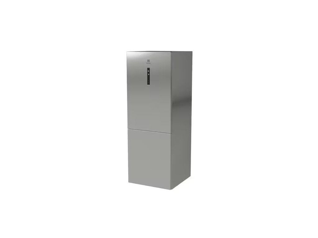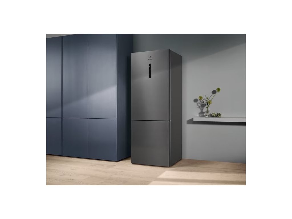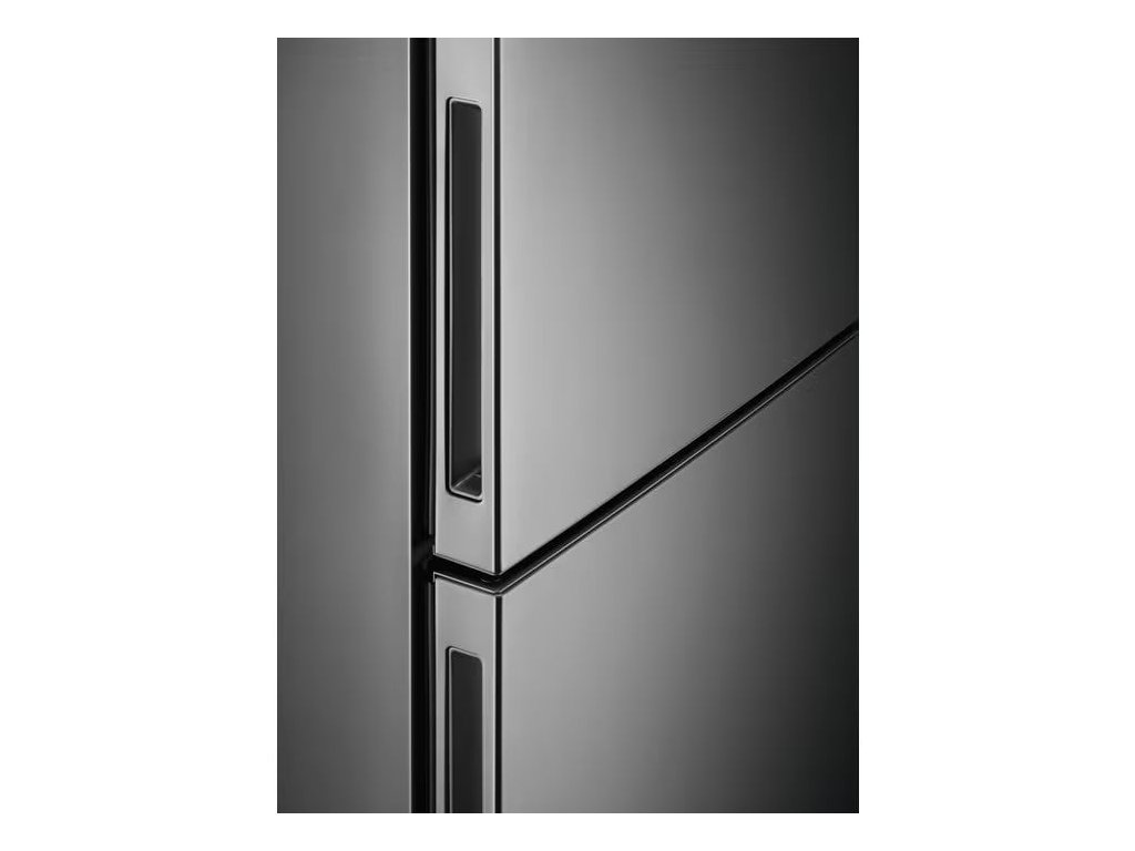 Volně stojící kombinovaná lednička s mrazákem dole, objem chladničky 344/137l, energetická třída E, barva: šedá a nerezové dveře s ochranou proti otiskům, roční spotřeba energie: 288 kWh, maximální hlučnost: 41 dB, výška 192 cm, šířka 70 cm.