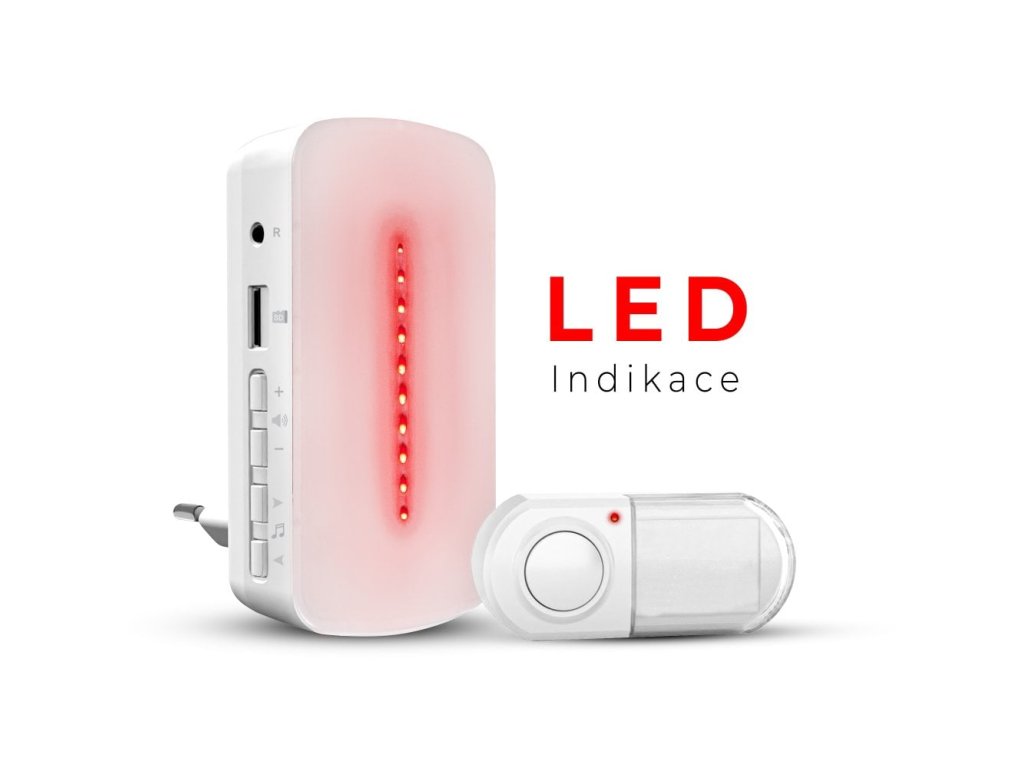 Bezdrátový zvonek s možností nahrání vlastní melodie MP3, nastavitelnou hlasitostí a světelnou indikací na přijímači.