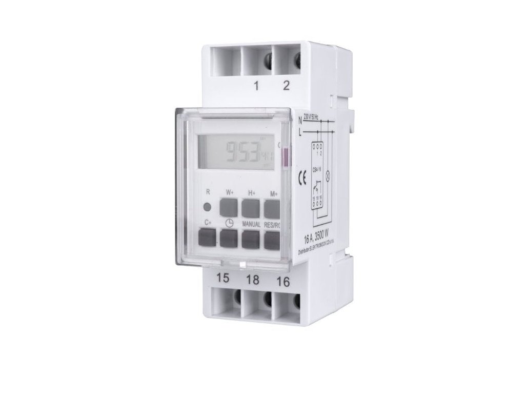 Digitální hodiny s týdenním programem. Maximální zátěž - 3680 W. Spínací prvek - relé 230V AC/16A. Montáž na DIN lištu. Záloha chodu více jak 100 hodin.