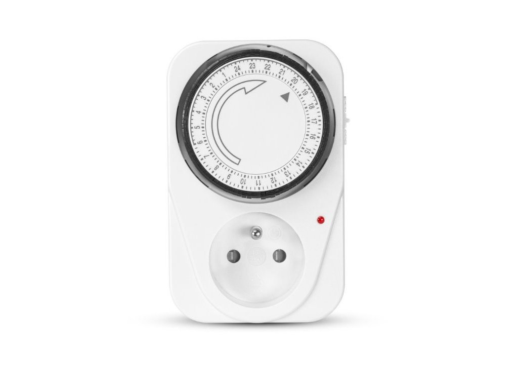 Mechanická spínací zásuvka s 24 hodinovým cyklem. Minimální nastavitelný časový úsek je 15 minut. SPÍNANÝ FÁZOVÝ VODIČ!