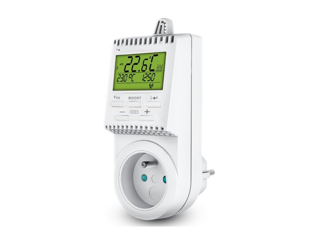 digitální tepelně spínáná zásuvka pro automatickou regulaci elektrických topných i chladící soustav (přímotopy, vysoušeče ručníků, krby, klimatizace) v rodinných domech, bytech, kancelářích. Je možné nastavit až šest časových intervalů s různými teplotními úrovněmi na každý den. Je vhodná do míst, kde se využívá přepínání NT a VT (nízkého a vysokého tarifu). Toto krátkodobé vypínání nezkracuje životnost přístroje a díky záloze času přístroj po obnovení napájení pokračuje v nastaveném programu.