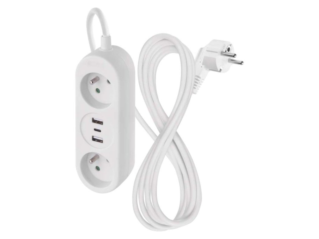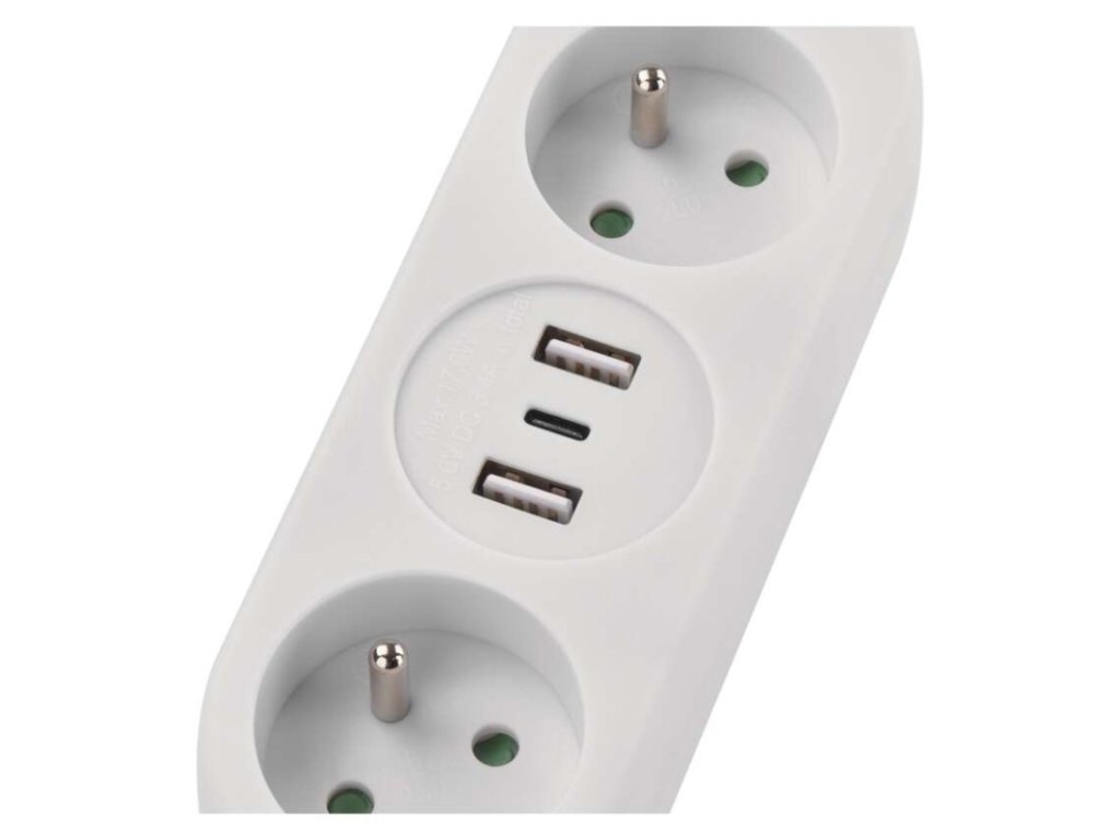 Bílý prodlužovací přívod s délkou 1,4 m, 2 zásuvkami s dětskými clonkami a 3 USB výstupy (2× USB-A, 1× USB-C). Max. zátěž 3680 W (16 A), vodič 1,5 mm2, bez vypínače. Krytí IP20. USB výstup: 5 V DC, celkově max. 3,4 A (17 W).