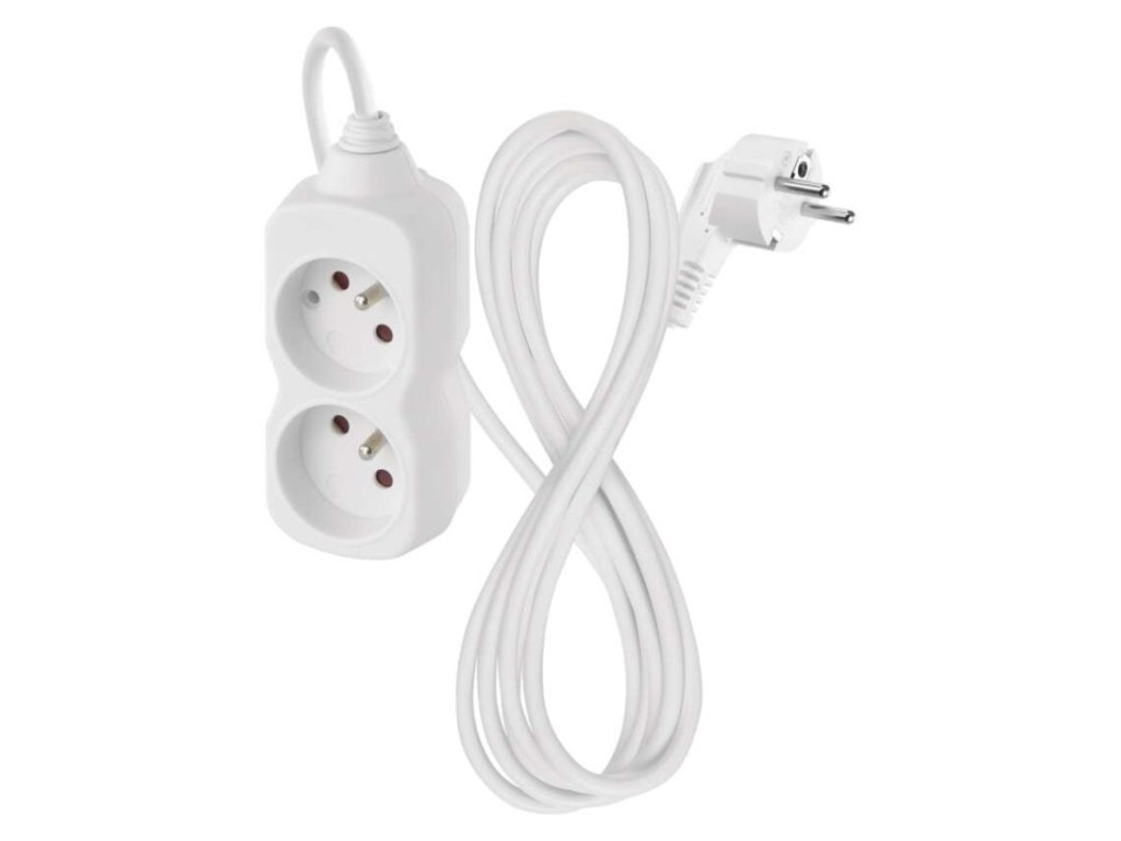 Bílý prodlužovací přívod, 2 zásuvky s dětskými clonkami a délkou 2 m. Průřezem vodiče 1 mm2. Vhodný pro maximální zátěž 16 A max.Při montáži na stěnu je nutné použít vrut se zápustnou hlavou PZ max. průměr 2,5–3 mm, délka 30–40 mm. V případě použití jiného průměru hrozí poškození plastové části otvoru. Pokud dojde k poškození plastové části otvoru, prodlužovací přívod nepoužívejte.