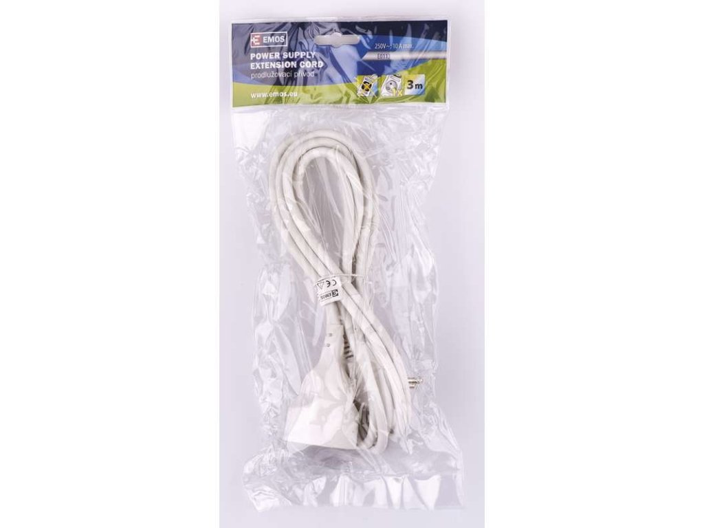 Bílý prodlužovací přívod s jednou zásuvkou - spojka, délkou 3 m a průřezem vodiče 1 mm2. Vhodný pro maximální zátěž 10 A max. Prodlužovací přívod 3 m na 230 V~ slouží k prodloužení elektrické energie tam, kam pevná zásuvka nedosáhne.