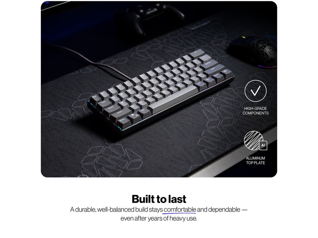 Konstrukce s horní hliníkovou deskou funguje jako opevnění proti mechanickému poškození. Ať je vaše vůle vyhrát jakkoli silná, Endorfy Thock V2 Compact to ustojí s přehledem. Lineární mechanické spínače Endorfy Red s nylonovou základnou podporuje hladký stisk bez zadrhávání.