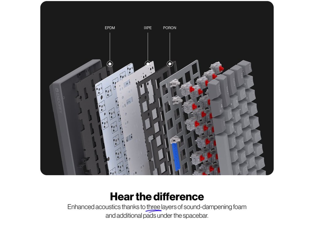 Speciální pozornost byla věnována akustickému ladění – klávesnice obsahuje tři vrstvy akustické pěny (PORON, EPDM a IXPE), které minimalizují ozvěnu a eliminují dutý zvuk. Dokonce i mezerník je utlumen silikonovými podložkami pro čistý a uspokojivý zvukový projev při psaní.