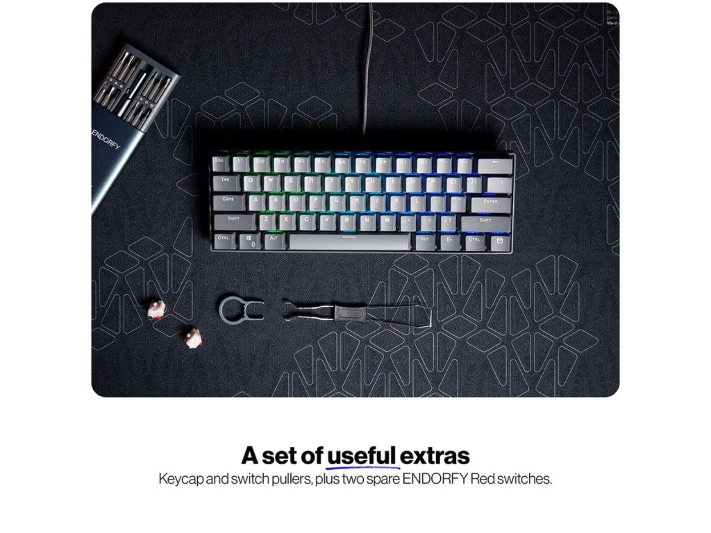 Klávesnice, herní, drátová, mechanická, Endorfy Red, US layout, 60% velikost, ARGB, hliníková konstrukce, USB, šedá