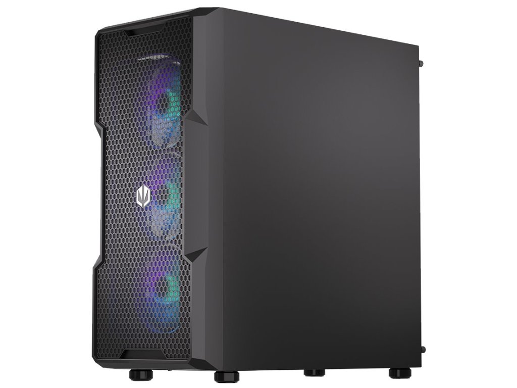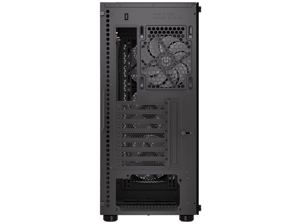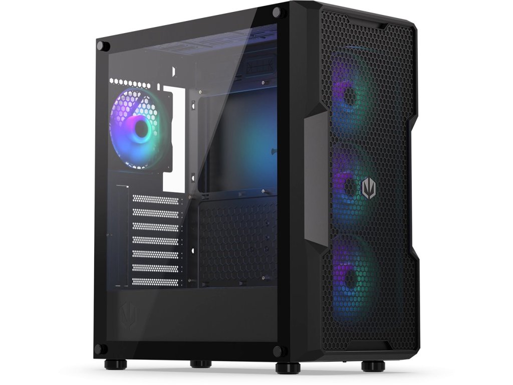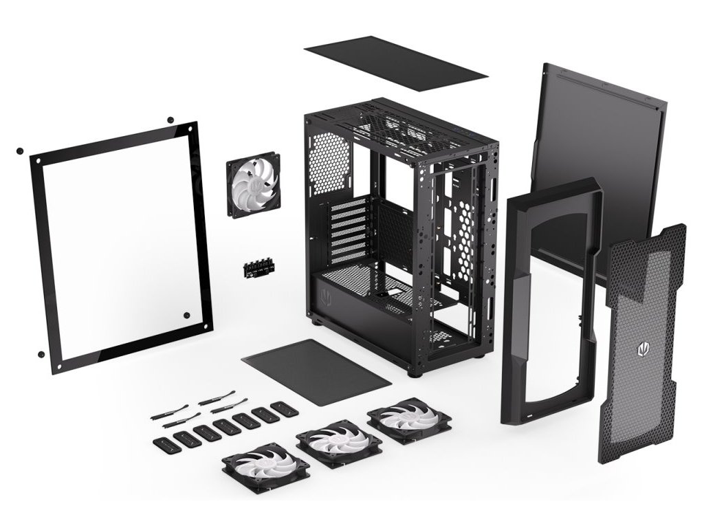 Skříň formátu Middle Tower s průhlednou bočnicí z tvrzeného skla nabízí dvě 2,5" pozice pro SSD disky a dvě 3,5" pozice pro pevné disky. Na horní části se nachází dva USB 3.0 porty, sluchátkový výstup a audio vstup pro mikrofon. Vybavena je čtyřmi 120 mm ventilátory s ARGB podsvícením, které spolu s perforovaným čelním panelem zajišťují dostatečné proudění vzduchu. Důmyslné řešení umožňuje pohodlné umístění až 360 mm dlouhého výměníku vodního chlazení na přední straně. Ve skříni je dostatek prostoru pro chladič CPU do výšky až 162 mm a grafickou kartu o délce až 370 mm. Dodávána je bez zdroje. Součástí je také interní ARGB ovladač a sada prachových filtrů.