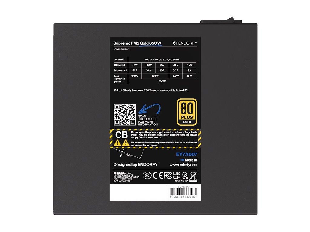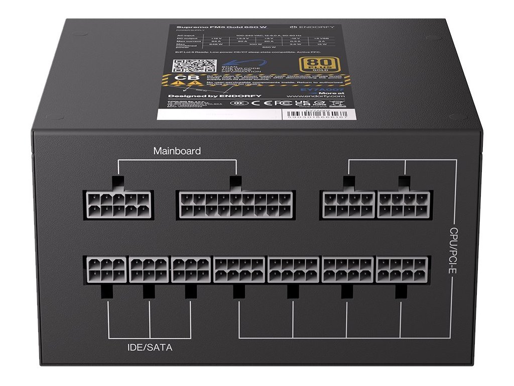 Napájecí zdroj o výkonu 650 W je osazen tichým, 120 mm velkým ventilátorem. Modulární kabeláž ušetří cenné místo ve skříni. Účinnost zdroje je 80PLUS Gold.