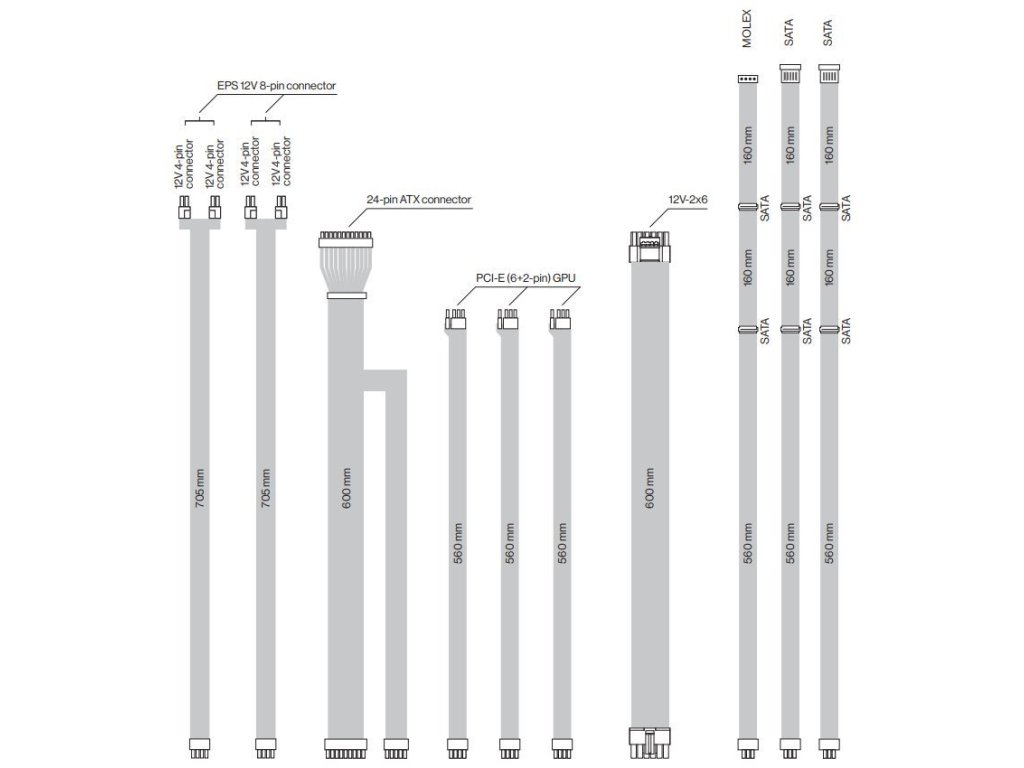 Napájecí konektory: 1× ATX 24pin, 2× EPS 12V 8pin, 3× PCIe 6+2pin, 1× PCIe 12+4pin (12V-2x6), 8× SATA, 1× molex