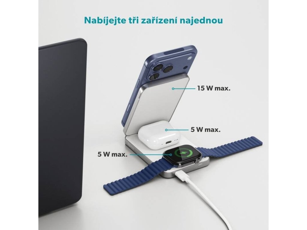 Porty/Výstupy: 4 výstupy lze používat současně (iPhone, Apple Watch, AirPods/TWS, USB-C).