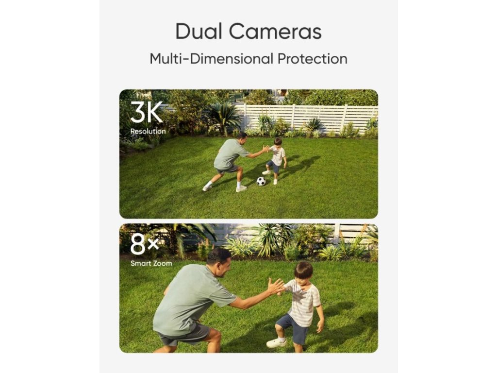 Dokonalý přehled o okolí zajišťuje nejen pohyb kamery s náklonem 70° a otáčením 360°, zorným polem 135°, ale i dvě kamery. Širokoúhlá, ve 3K rozlišení (2880×1620) a teleobjektivní, s 2K rozlišením (2304×1296).