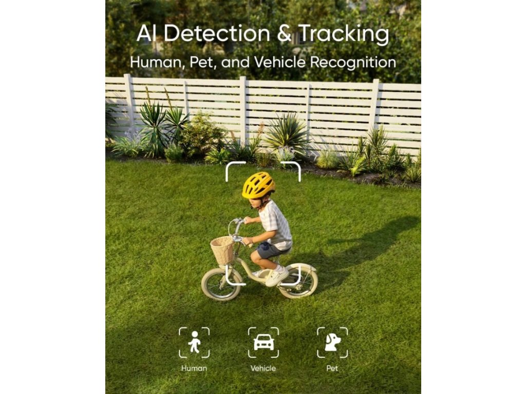 Kamera detekuje pohyb člověka i vozidla a okamžitou notifikací na mobilní telefon upozorní na možné narušení a je kompatibilní s hlasovými asistenty Alexa a Google Assistant