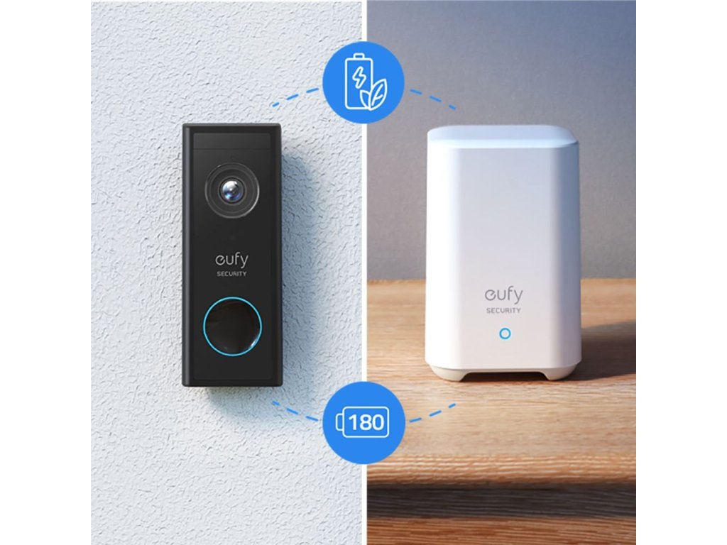 Eufy Video Doorbell + Homebase. Bezdrátový video zvonek s centrální jednotkou, 2650 x 1920 px, 160° zorný úhel, noční vidění, výdrž baterie až 6 měsíců na jedno nabití, Wi-Fi 2.4G, mikrofon a reproduktor, IP65, iOS/Android.