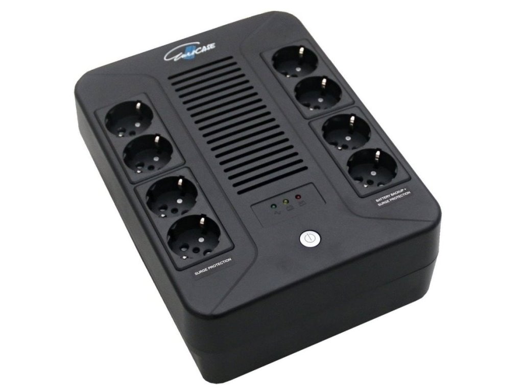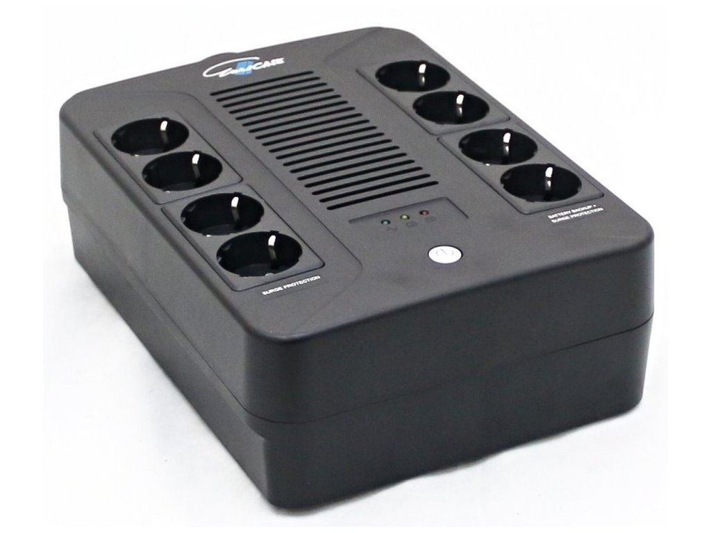 Záložní zdroj kompaktní velikosti, přizpůsobený i k zavěšení na stěnu. Na čelním panelu nalezneme vypínač ON/OFF a indikační LED.