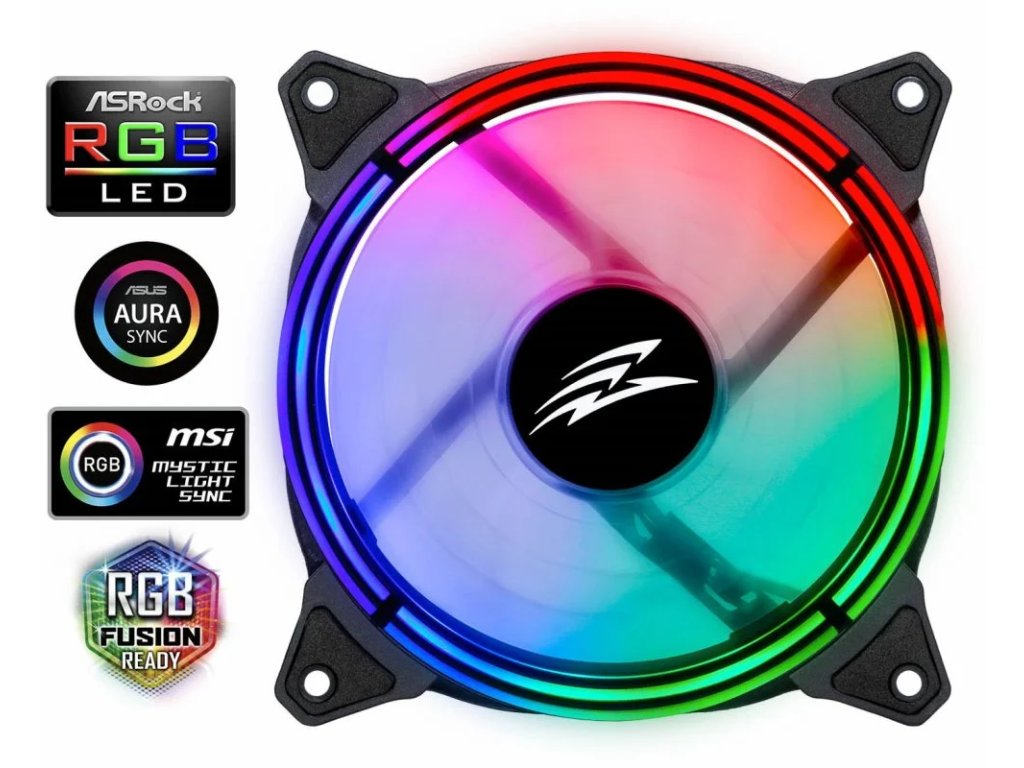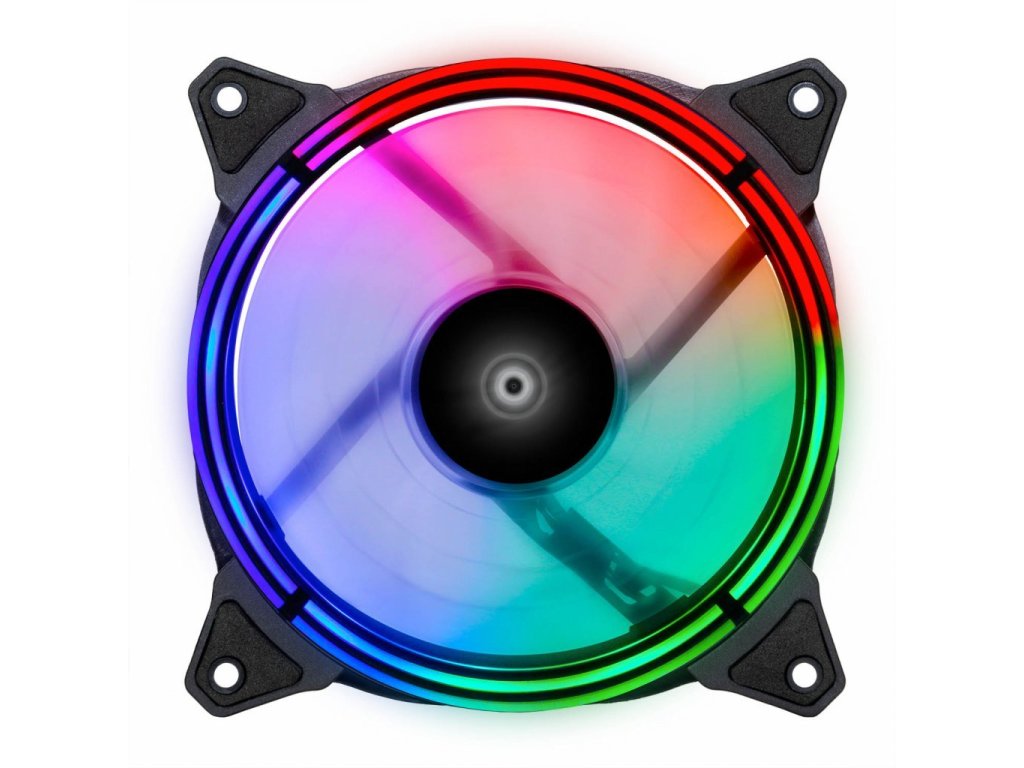 RGB LED ventilátor typu rainbow s LED diodami umístěnými ve vnějším obvodu, jedná se o tzv. typ ring. Ventilátor umožňuje najednou zobrazit všech sedm barev duhového spektra. Jedná se o podřízený ventilátor, který je určen pro použití s řídícím ventilátorem EVOLVEO 12RM. LED osvětlení je ovládáno pomocí tlačítka reset nebo LED tlačítka na ovládacím panelu skříně nebo připojením přiloženého ARGB kabelu k základní desce.