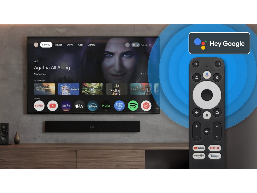 • Hlasové ovládání přes Google Assistant – v dálkovém ovladači je zabudovaný mikrofon pro rychlé vyhledávání a ovládání hlasem