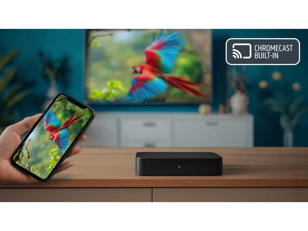 Evolveo Dcolor GD2 má integrovanou technologii Chromecast, takže už nemusíte řešit žádné kabely ani složité aplikace. Jedním kliknutím můžete „odeslat" video, film, fotky nebo třeba hudbu z mobilu či tabletu rovnou na obrazovku televize. Funguje to s oblíbenými aplikacemi jako je YouTube, Netflix, Spotify a stovkami dalších. Stačí mít zařízení ve stejné Wi-Fi síti a během vteřiny máte obsah ve velkém formátu.