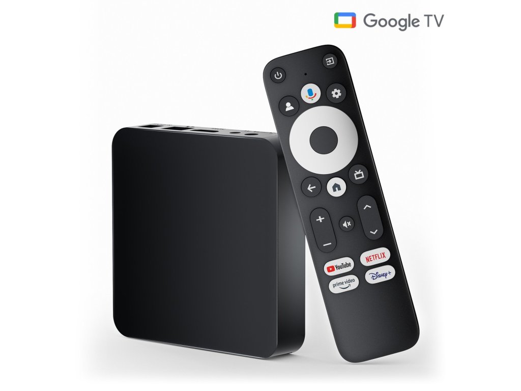 Google TV box, podpora 4K Ultra HD, úložiště 32 GB, RAM paměť 2 GB, operační systém Android 12, podpora aplikací Netflix, Disney+, Prime video, Oneplay, HBO Max, Apple TV, Skylink Live TV, YouTube, Spotify