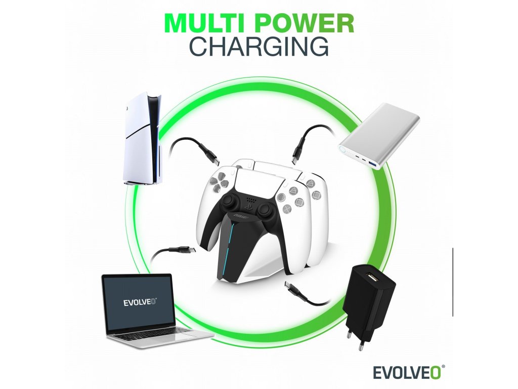 Základna EVOLVEO DockCharge je mistrem multitaskingu – dokáže nabíjet dva ovladače DualSense současně, takže ji oceníte nejen při sólovém hraní, ale i při epických multiplayerových bitvách. Díky USB-C portu na zadní straně s ní máte na výběr hned čtyři možnosti napájení – můžete ji připojit přímo ke konzoli, k notebooku, k powerbance nebo využít adaptér (pokud ho máte zrovna po ruce). A co je vůbec nejlepší? Oba vaše ovladače zvládne plně nabít za pouhé tři hodiny.