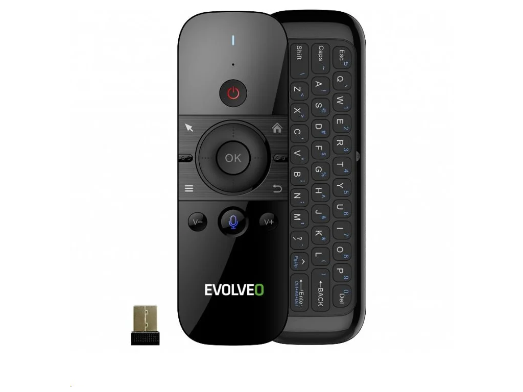 AirMouse a klávesnice 2v1, 6ti-osé měření pohybu, podpora ovládání hlasem, IR programovatelné tlačítko, vestavěná lithiová baterie, podpora Plug & Play, USB adaptér 2.4 GHz