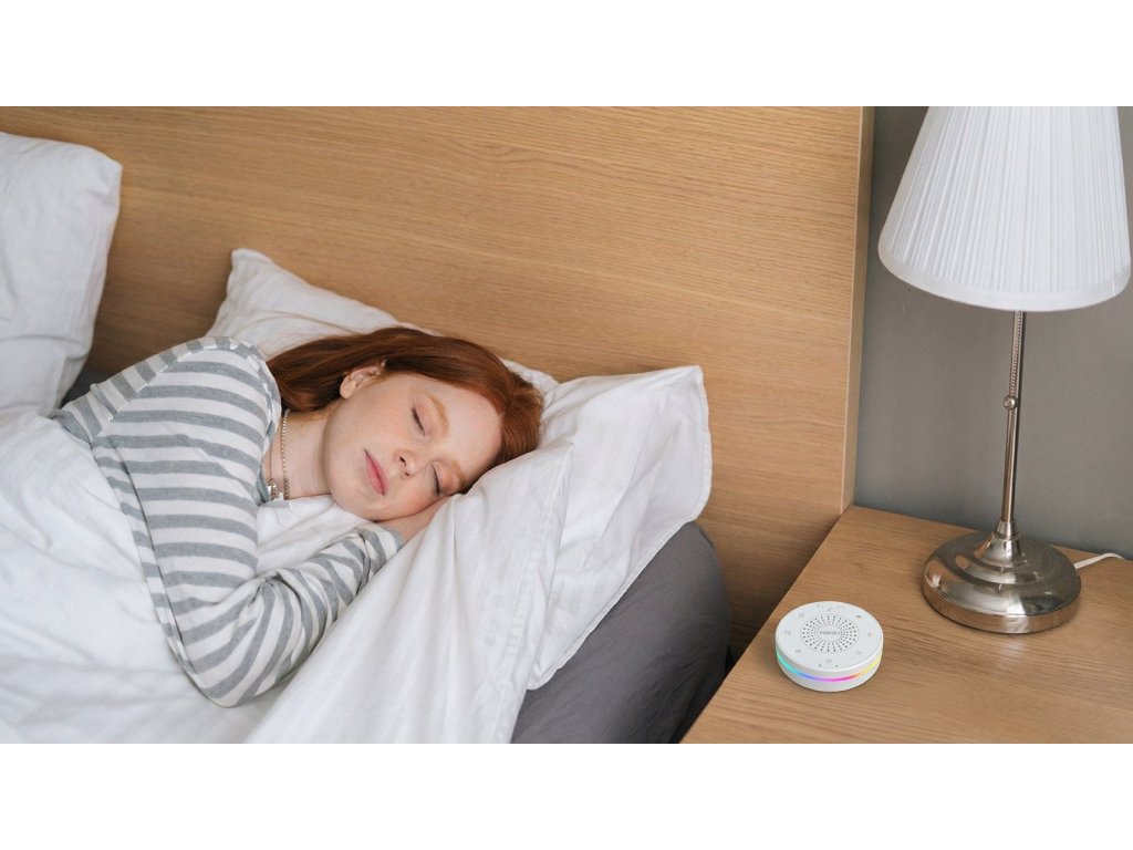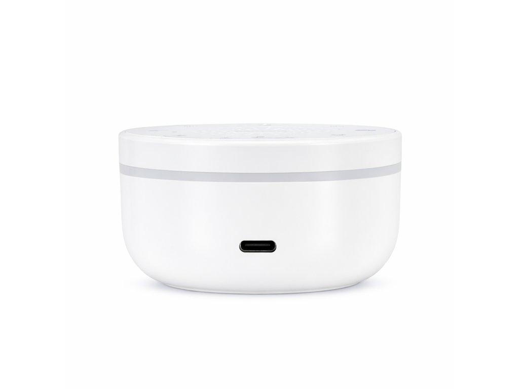 Uspávací modul s bílým šumem (6 variant), barevným světlem, 9 ukolébavek, 15 zvuků přírody, časovač baterie 1000 mAh, bílý