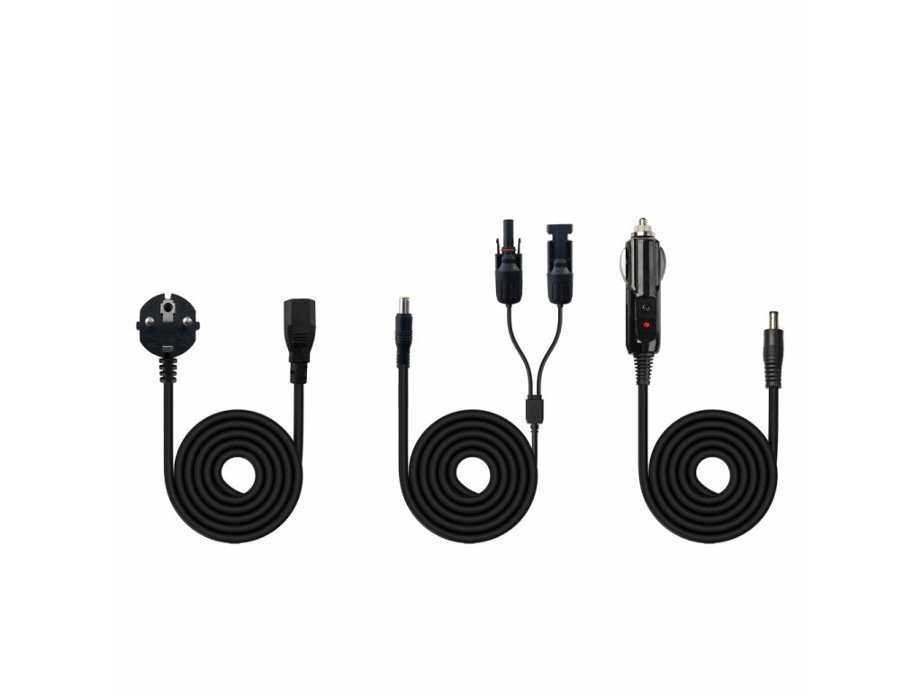 Součástí balení je sada nabíjecích kabelů. Tato sada obsahuje síťový kabel, nabíjecí kabel do autozásuvky a solární dobíjecí kabel. Díky těmto kabelům budete moci pohodlně nabíjet svou nabíjecí stanici nejen ze zásuvky, ale také během jízdy autem nebo pomocí solárního panelu.
