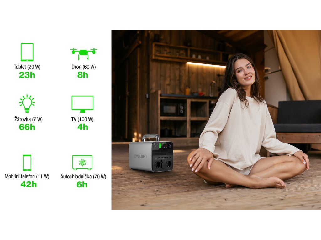 • Výdrž napájení spotřebiče: tablet (20 W) – 23 h, dron (60 W) – 8 h, mobilní telefon (11 W) – 42 h, žárovka (7 W) – 66 h, TV (100 W) – 4 h, autochladnička (70 W) - 6 h