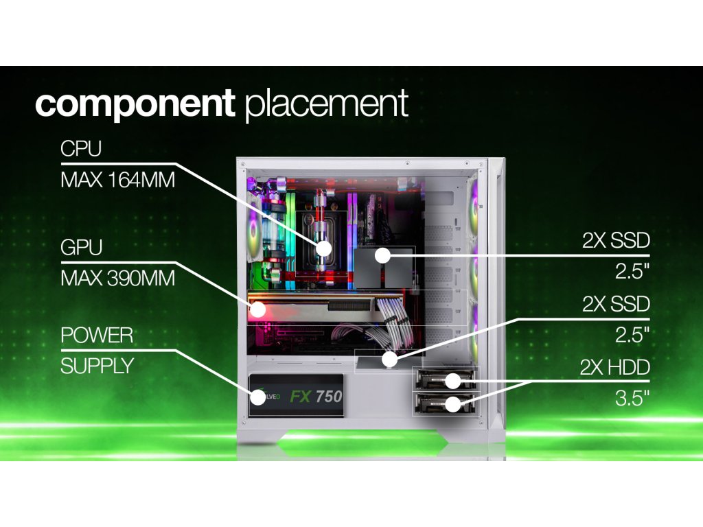 Vnitřní prostor této herní počítačové skříně je navržen tak velkoryse, že může být základem i pro ty nejambicióznější počítačové sestavy. Chladič procesoru může měřit až 164 mm na výšku. Grafická karta se sem vejde v délce až 390 mm. A pro ukládání dat je k dispozici místo pro 2 klasické pevné disky (3,5") a 3 moderní rychlá SSD úložiště (2,5"). Každá hardwarová součástka je zkrátka v této digitální pevnosti vítaným hostem a dostane se jí péče jako na císařském dvoře. Roli přitom nehraje ani její urozený původ – do skříně se dají vložit základní desky Intel i AMD, přičemž jsou podporovány formáty ATX, eATX (Extended ATX), mATX (Micro ATX) i mITX (mini ITX).