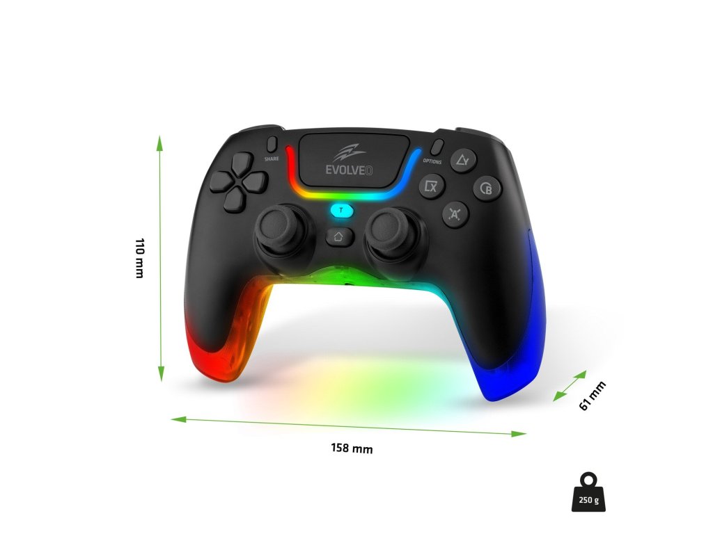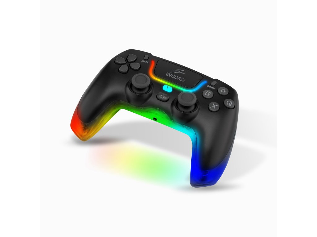 EVOLVEO Ptero2 nabízí celkem 21 ovládacích prvků, takže máte dění v jakékoliv hře pod kontrolou. 2 analogové páčky s automatickou rekognicí síly a směru pohybu jsou opatřeny pogumovanými povrchy, takže vám i během intenzivního hraní zajišťují pevný úchop. Pohodlné ovládání všeho potřebného pak obstarávají i čtyřtlačítkové křížové ovládače na obou stranách gamepadu, klávesy L1, L2, R1 a R2, programovatelná makro tlačítka M1 a M2 či tlačítko T (Turbo) se dvěma režimy podsvícení (v závislosti na akcích ve hře buď svítí, nebo problikává). V neposlední řadě pak určitě oceníte i přítomnost touchpadu či praktických tlačítek jako Home, Share a Options.