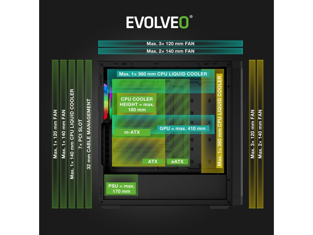 V počítačové skříni EVOLVEO Scorpio-BK-4 je dostatek místa na všechno, co má nadupaná herní mašina mít. Vejde se sem až 415mm grafická karta, chladič procesoru o výšce až 180 mm i všechny potřebné disky – ve skříni jsou 4 pozice pro 3,5" HDD a 5 slotů pro 2,5" SSD. Nic vám tak nebrání sestavit si počítač, jehož hardware hraje první ligu. O to, aby vnitřek skříně působil čistě a profesionálně, se navíc stará 32mm Cable Management pro skrytí kabeláže.